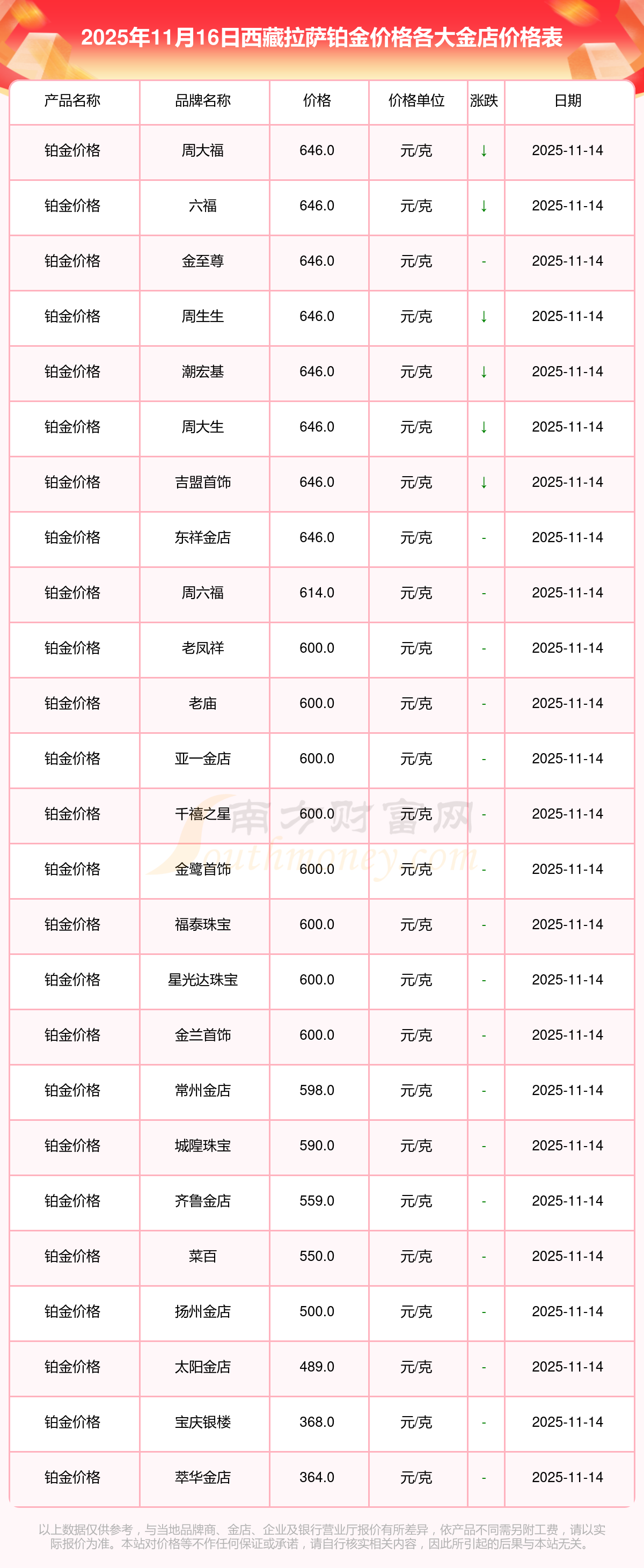 2025年11月16日西藏拉薩周大福、周大福、周大福、周大福、周大福、周大福、周大福、老鳳祥、老鳳祥、老鳳祥、周六福等各大金店品牌鉑金價格最新價格如下:周大福黃金價格1333.0元/克,周大福鉑金價格646.0元/克,周大福飾品金價(內(nèi)地)1333.0元/克,周大福黃金飾品(香港)46320.0,周大福鉑金價格(香港)18410.0,周大福金條價格(香港)41780.0,周大福金條金價(內(nèi)地)1167.0元/克,老鳳祥黃金價格1322.0元/克,老鳳祥鉑金價格600.0元/克,老鳳祥足金價格1322.0元/克,周六福黃金價格1295.0元/克。