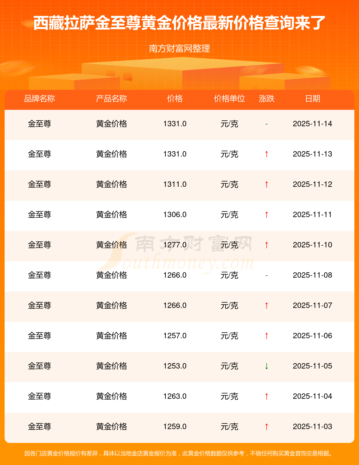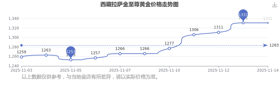 西藏拉薩金至尊 2025年11月16日的黃金價格價位為 1331.0元/克。