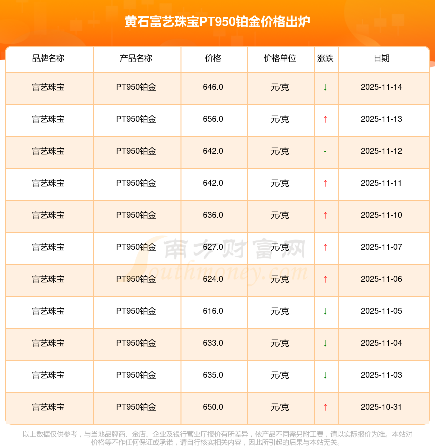 今天是2025年11月16日,周大福、周大福、周大福、周大福、周大福、周大福、周大福、老鳳祥、老鳳祥、老鳳祥、周六福等各大金店品牌PT950鉑金最新價(jià)格如下:周大福1333.0元/克、周大福646.0元/克、周大福1333.0元/克、周大福46320.0、周大福18410.0、周大福41780.0、周大福1167.0元/克、老鳳祥1322.0元/克、老鳳祥600.0元/克、老鳳祥1322.0元/克、周六福1295.0元/克。