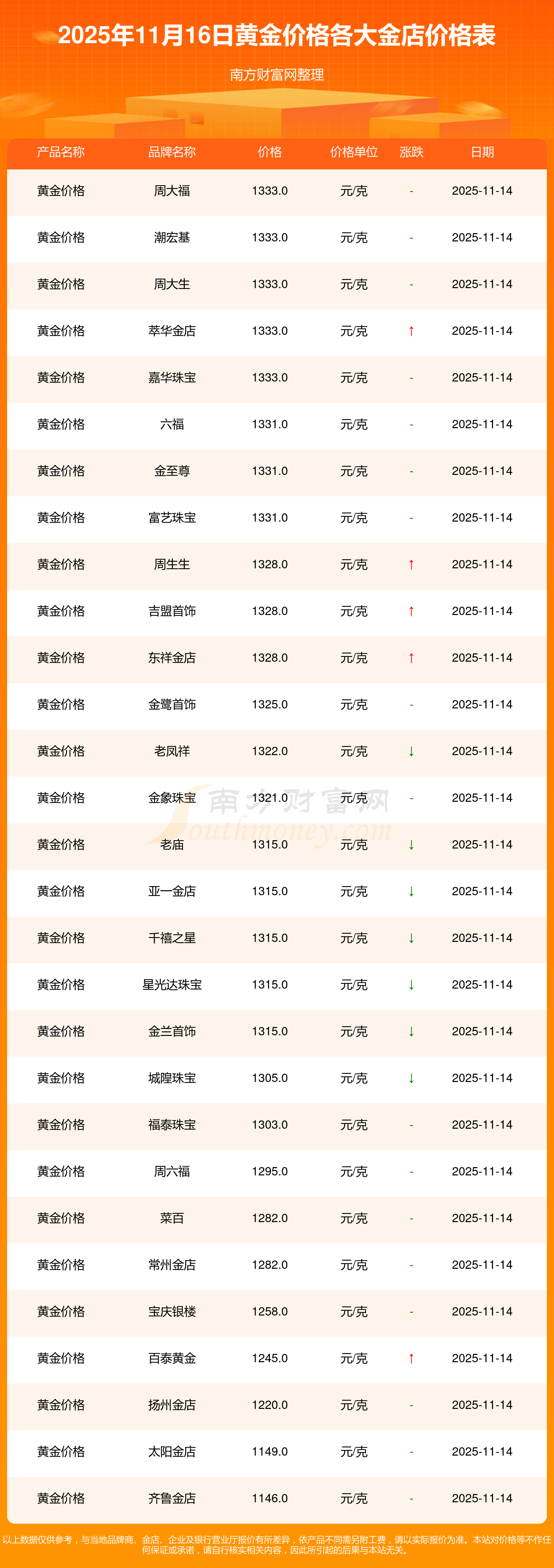 2025年11月16日周大福、周大福、周大福、周大福、周大福、周大福、周大福、老鳳祥、老鳳祥、老鳳祥、周六福等各大金店品牌黃金價(jià)格最新價(jià)格如下:周大福黃金價(jià)格1333.0元/克,周大福鉑金價(jià)格646.0元/克,周大福飾品金價(jià)(內(nèi)地)1333.0元/克,周大福黃金飾品(香港)46320.0,周大福鉑金價(jià)格(香港)18410.0,周大福金條價(jià)格(香港)41780.0,周大福金條金價(jià)(內(nèi)地)1167.0元/克,老鳳祥黃金價(jià)格1322.0元/克,老鳳祥鉑金價(jià)格600.0元/克,老鳳祥足金價(jià)格1322.0元/克,周六福黃金價(jià)格1295.0元/克。