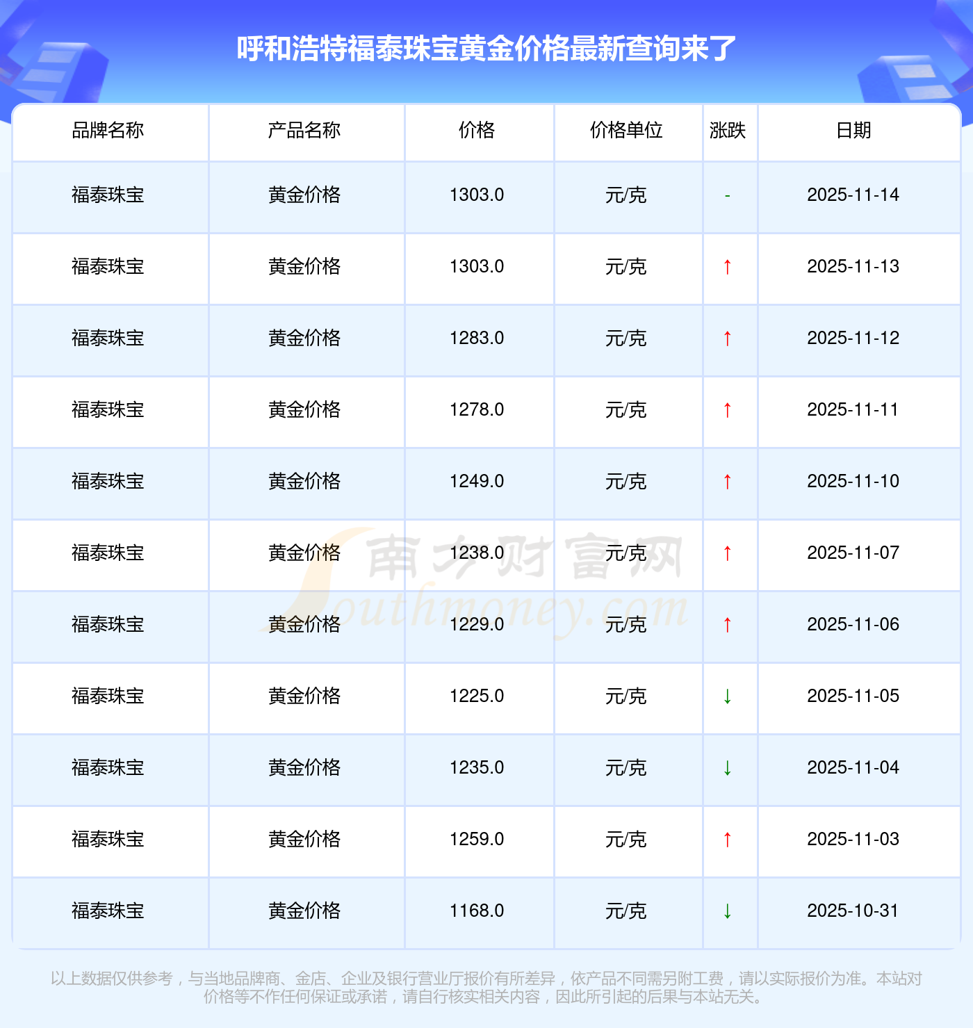 今日(2025年11月16日),呼和浩特福泰珠寶黃金價格:1303.0元/克。
