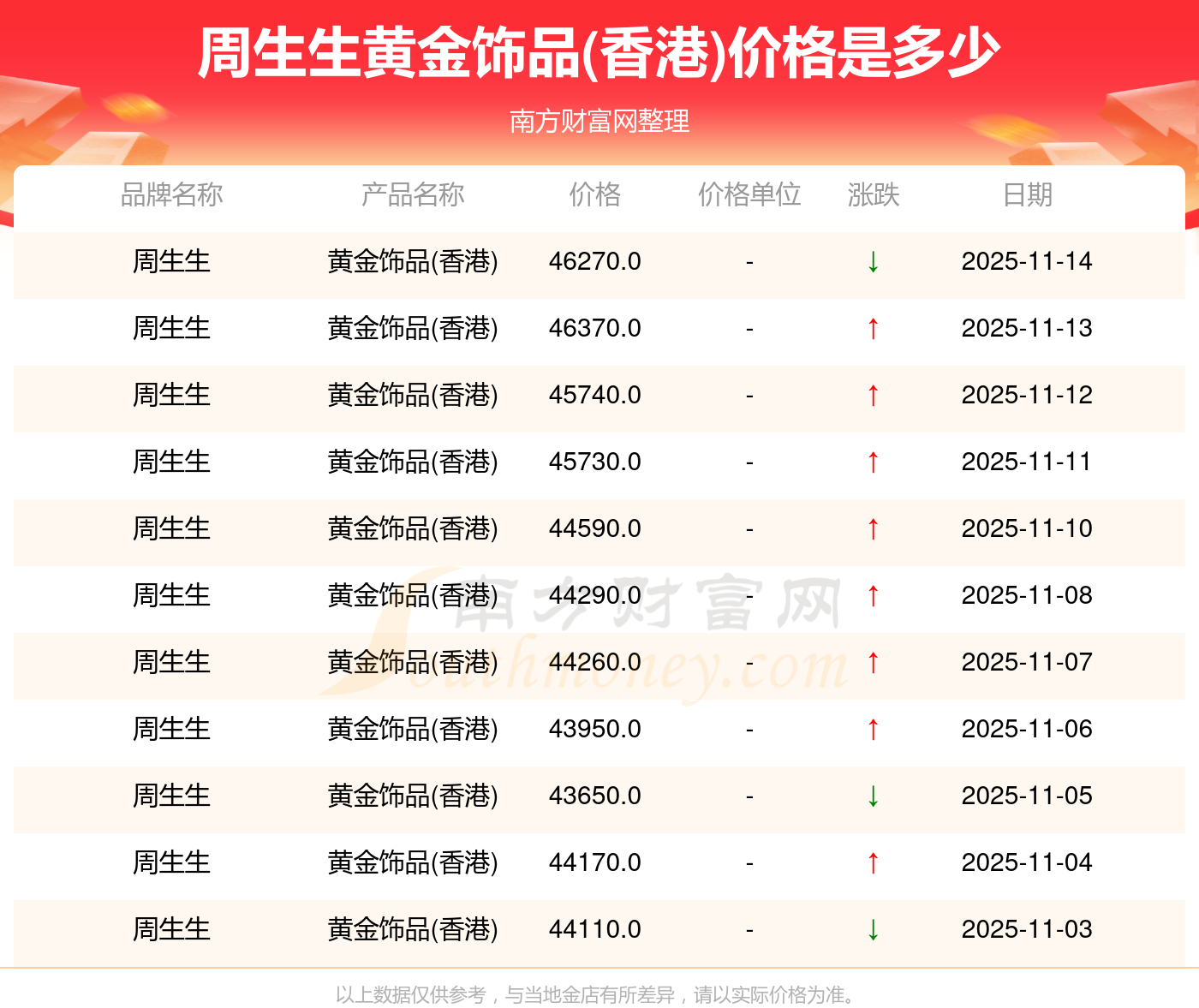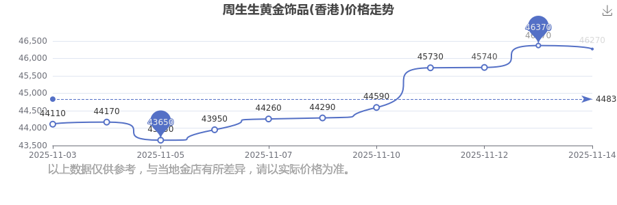 今日周生生黃金飾品(香港)價格最新為46270.0。