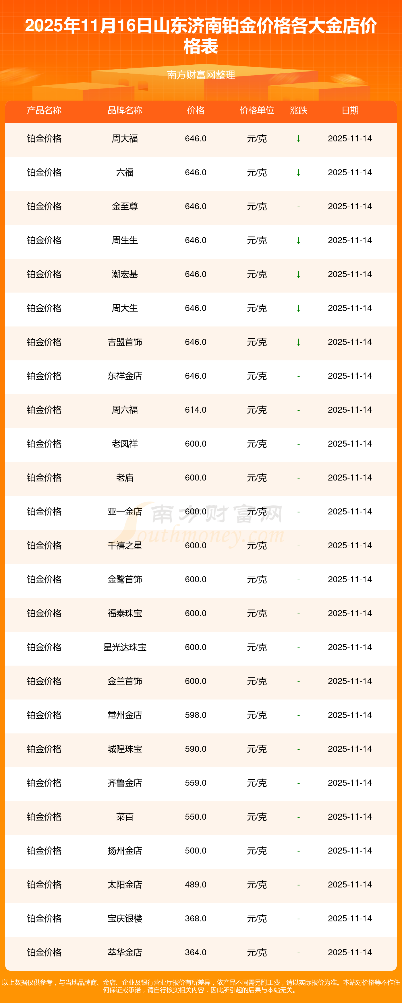 2025年11月16日山東濟南各大金店鉑金價格最新價格查詢來了:周大福1333.0元/克,周大福646.0元/克,周大福1333.0元/克,周大福46320.0,周大福18410.0,周大福41780.0,周大福1167.0元/克,老鳳祥1322.0元/克,老鳳祥600.0元/克,老鳳祥1322.0元/克,周六福1295.0元/克。