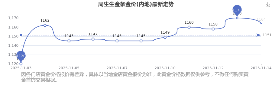 2025年11月16日周生生金條金價(jià)(內(nèi)地)是1164.0元/克。
