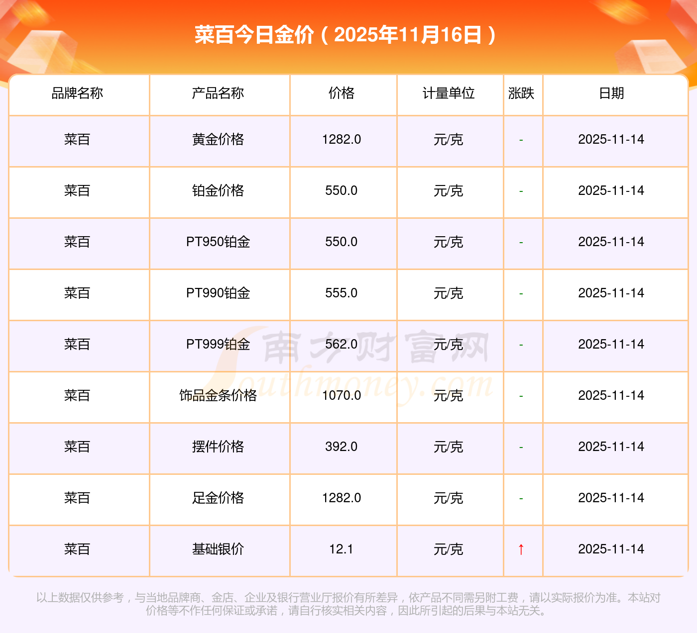 黃金價(jià)格1333.0元/克,鉑金價(jià)格646.0元/克,飾品金價(jià)(內(nèi)地)1333.0元/克,黃金飾品(香港)46320.0,鉑金價(jià)格(香港)18410.0,金條價(jià)格(香港)41780.0,金條金價(jià)(內(nèi)地)1167.0元/克,黃金價(jià)格1322.0元/克,鉑金價(jià)格600.0元/克,足金價(jià)格1322.0元/克,黃金價(jià)格1295.0元/克。
