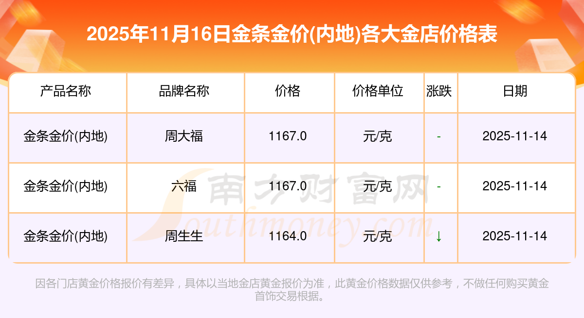 2025年11月16日周大福、周大福、周大福、周大福、周大福、周大福、周大福、老鳳祥、老鳳祥、老鳳祥、周六福等各大金店品牌金條金價(jià)(內(nèi)地)最新價(jià)格如下:周大福黃金價(jià)格1333.0元/克,周大福鉑金價(jià)格646.0元/克,周大福飾品金價(jià)(內(nèi)地)1333.0元/克,周大福黃金飾品(香港)46320.0,周大福鉑金價(jià)格(香港)18410.0,周大福金條價(jià)格(香港)41780.0,周大福金條金價(jià)(內(nèi)地)1167.0元/克,老鳳祥黃金價(jià)格1322.0元/克,老鳳祥鉑金價(jià)格600.0元/克,老鳳祥足金價(jià)格1322.0元/克,周六福黃金價(jià)格1295.0元/克。