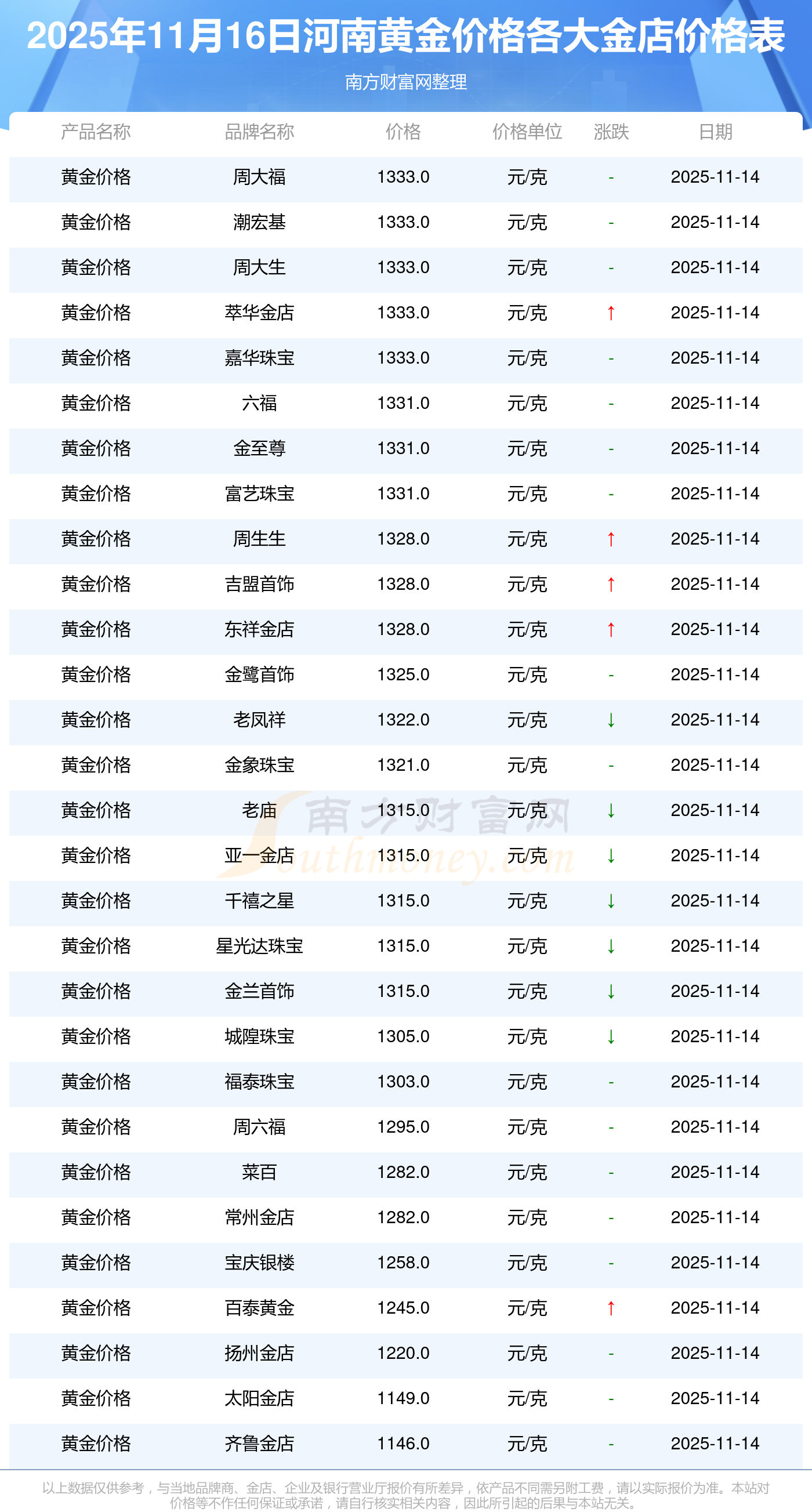 2025年11月16日,河南周大福、周大福、周大福、周大福、周大福、周大福、周大福、老鳳祥、老鳳祥、老鳳祥、周六福等各大金店品牌黃金價(jià)格今日價(jià)格行情最新來了:周大福1333.0元/克、周大福646.0元/克、周大福1333.0元/克、周大福46320.0、周大福18410.0、周大福41780.0、周大福1167.0元/克、老鳳祥1322.0元/克、老鳳祥600.0元/克、老鳳祥1322.0元/克、周六福1295.0元/克。
