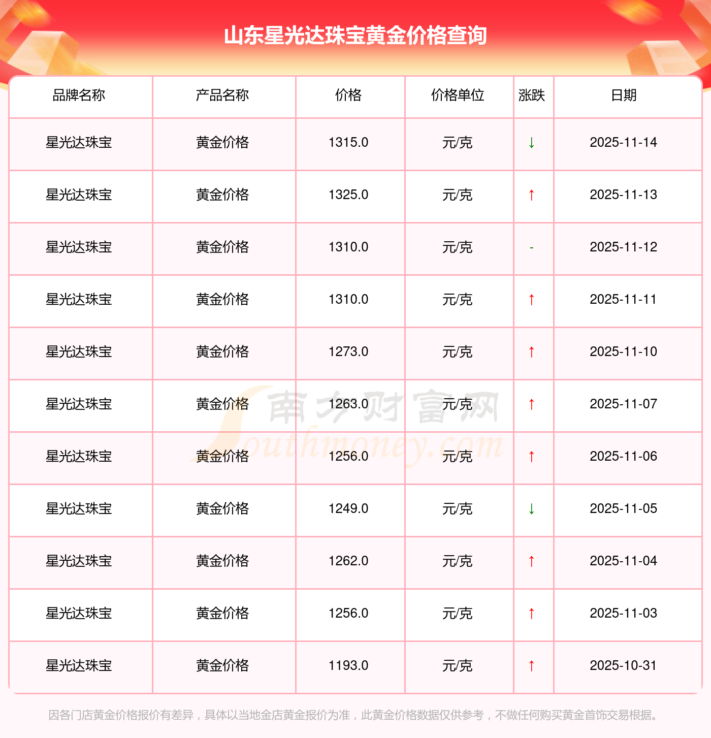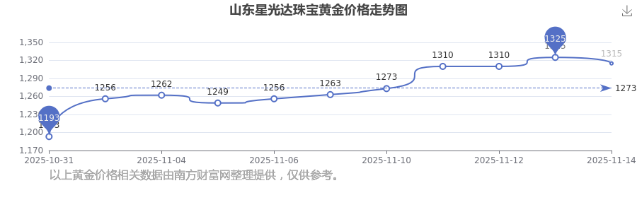 2025年11月16日,山東星光達(dá)珠寶黃金價(jià)格每克的售賣價(jià)位為1315.0元/克。