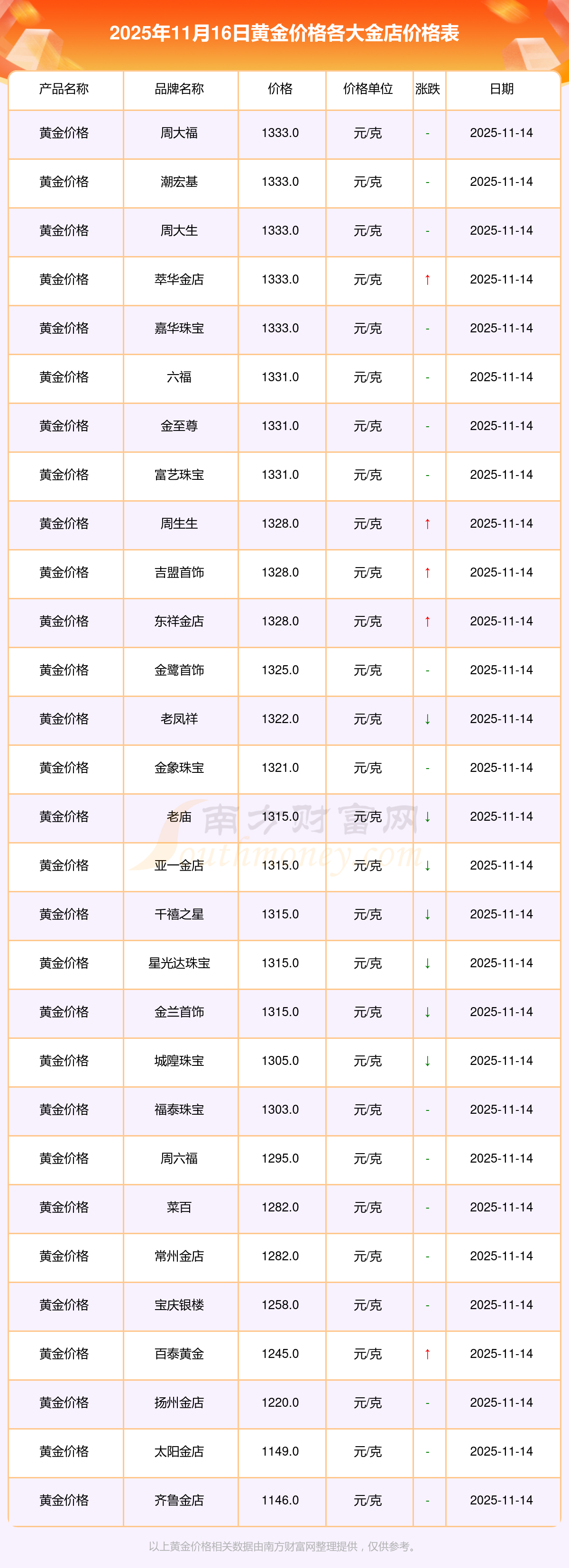 2025年11月16日周大福、周大福、周大福、周大福、周大福、周大福、周大福、老鳳祥、老鳳祥、老鳳祥、周六福等各大金店品牌黃金價(jià)格最新價(jià)格如下:周大福黃金價(jià)格1333.0元/克,周大福鉑金價(jià)格646.0元/克,周大福飾品金價(jià)(內(nèi)地)1333.0元/克,周大福黃金飾品(香港)46320.0,周大福鉑金價(jià)格(香港)18410.0,周大福金條價(jià)格(香港)41780.0,周大福金條金價(jià)(內(nèi)地)1167.0元/克,老鳳祥黃金價(jià)格1322.0元/克,老鳳祥鉑金價(jià)格600.0元/克,老鳳祥足金價(jià)格1322.0元/克,周六福黃金價(jià)格1295.0元/克。