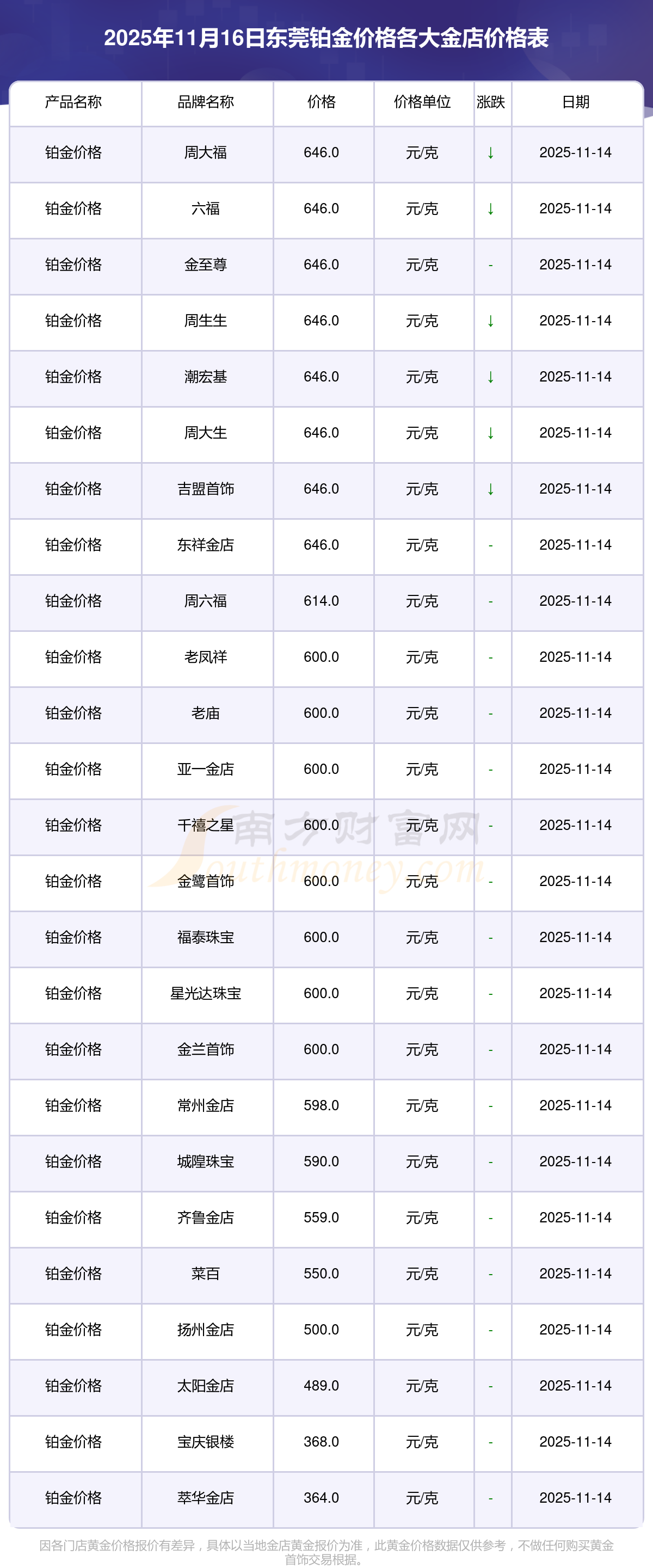 2025年11月16日東莞周大福、周大福、周大福、周大福、周大福、周大福、周大福、老鳳祥、老鳳祥、老鳳祥、周六福等各大金店品牌鉑金價(jià)格最新價(jià)格如下:周大福黃金價(jià)格1333.0元/克,周大福鉑金價(jià)格646.0元/克,周大福飾品金價(jià)(內(nèi)地)1333.0元/克,周大福黃金飾品(香港)46320.0,周大福鉑金價(jià)格(香港)18410.0,周大福金條價(jià)格(香港)41780.0,周大福金條金價(jià)(內(nèi)地)1167.0元/克,老鳳祥黃金價(jià)格1322.0元/克,老鳳祥鉑金價(jià)格600.0元/克,老鳳祥足金價(jià)格1322.0元/克,周六福黃金價(jià)格1295.0元/克。