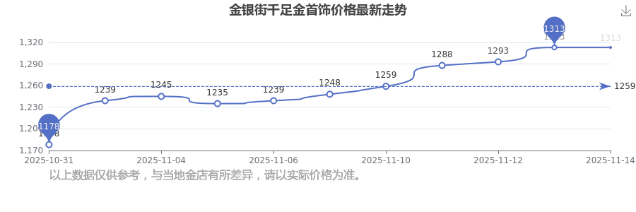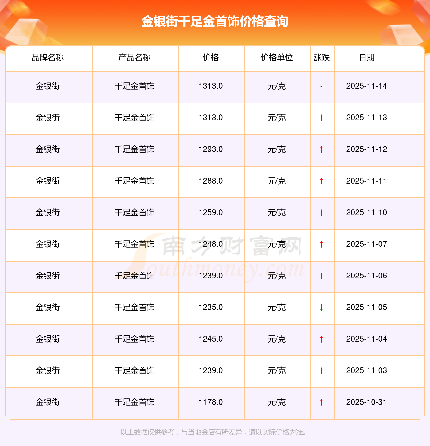 2025年11月16日金銀街千足金首飾價(jià)格為1313.0元/克。