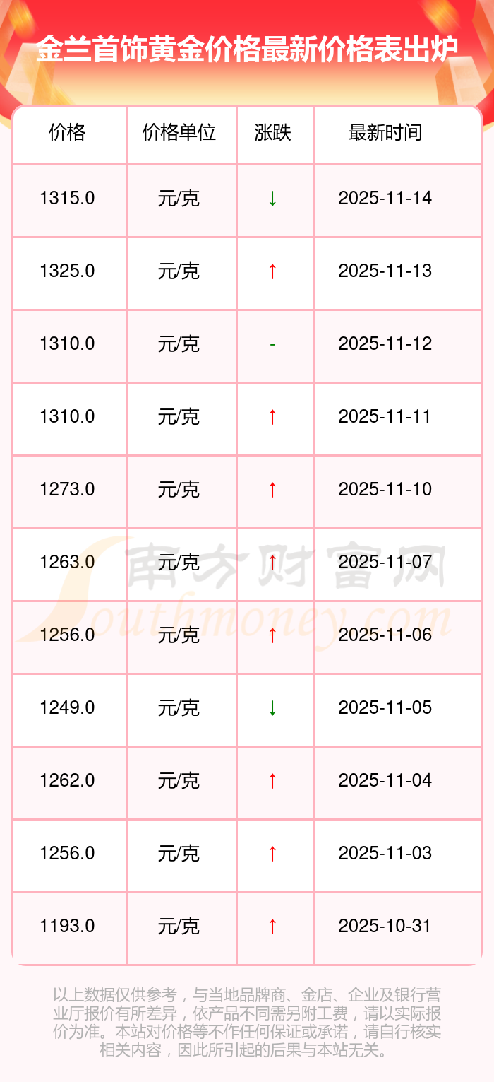 今日黃金價(jià)格查詢_現(xiàn)在金價(jià)黃金一克多少錢,黃金價(jià)格是多少錢一克?黃金價(jià)格一般是多少錢一克?金蘭首飾 黃金價(jià)格于今日的最新掛牌價(jià)為1315.0元/克。