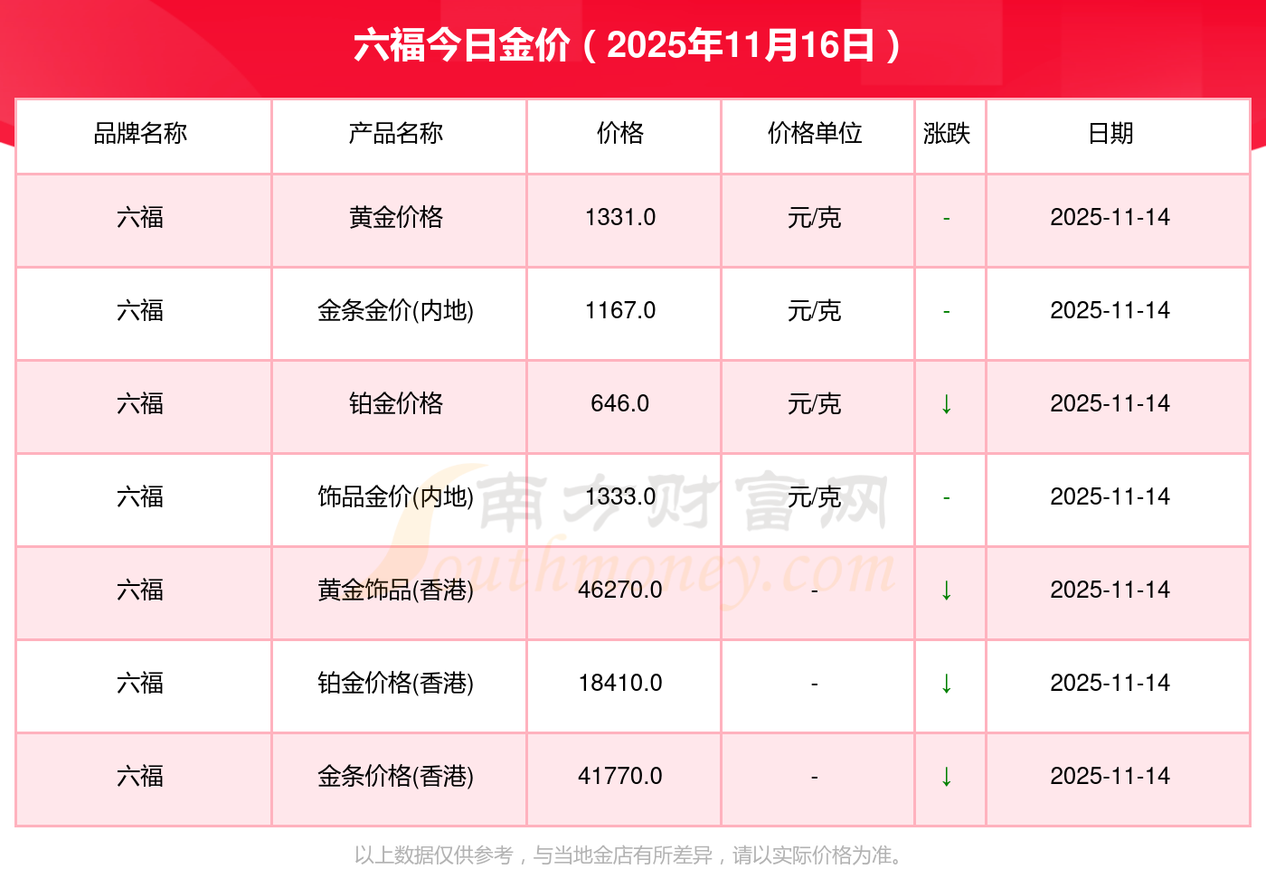 2025年11月16日周大福、周大福、周大福、周大福、周大福、周大福、周大福、老鳳祥、老鳳祥、老鳳祥、周六福等各大金店品牌飾品金價(內(nèi)地)最新價格如下:周大福黃金價格1333.0元/克,周大福鉑金價格646.0元/克,周大福飾品金價(內(nèi)地)1333.0元/克,周大福黃金飾品(香港)46320.0,周大福鉑金價格(香港)18410.0,周大福金條價格(香港)41780.0,周大福金條金價(內(nèi)地)1167.0元/克,老鳳祥黃金價格1322.0元/克,老鳳祥鉑金價格600.0元/克,老鳳祥足金價格1322.0元/克,周六福黃金價格1295.0元/克。