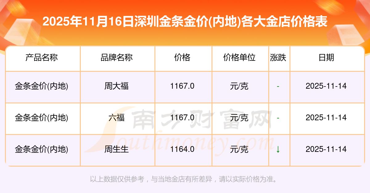 2025年11月16日,深圳周大福、周大福、周大福、周大福、周大福、周大福、周大福、老鳳祥、老鳳祥、老鳳祥、周六福等各大金店品牌金條金價(內(nèi)地)今日價格行情最新來了:周大福1333.0元/克、周大福646.0元/克、周大福1333.0元/克、周大福46320.0、周大福18410.0、周大福41780.0、周大福1167.0元/克、老鳳祥1322.0元/克、老鳳祥600.0元/克、老鳳祥1322.0元/克、周六福1295.0元/克。