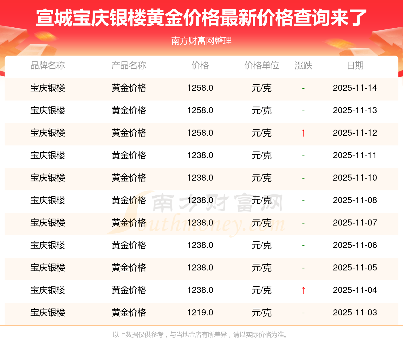 (2025年11月16日)宣城寶慶銀樓黃金價格現(xiàn)在為1258.0元/克。