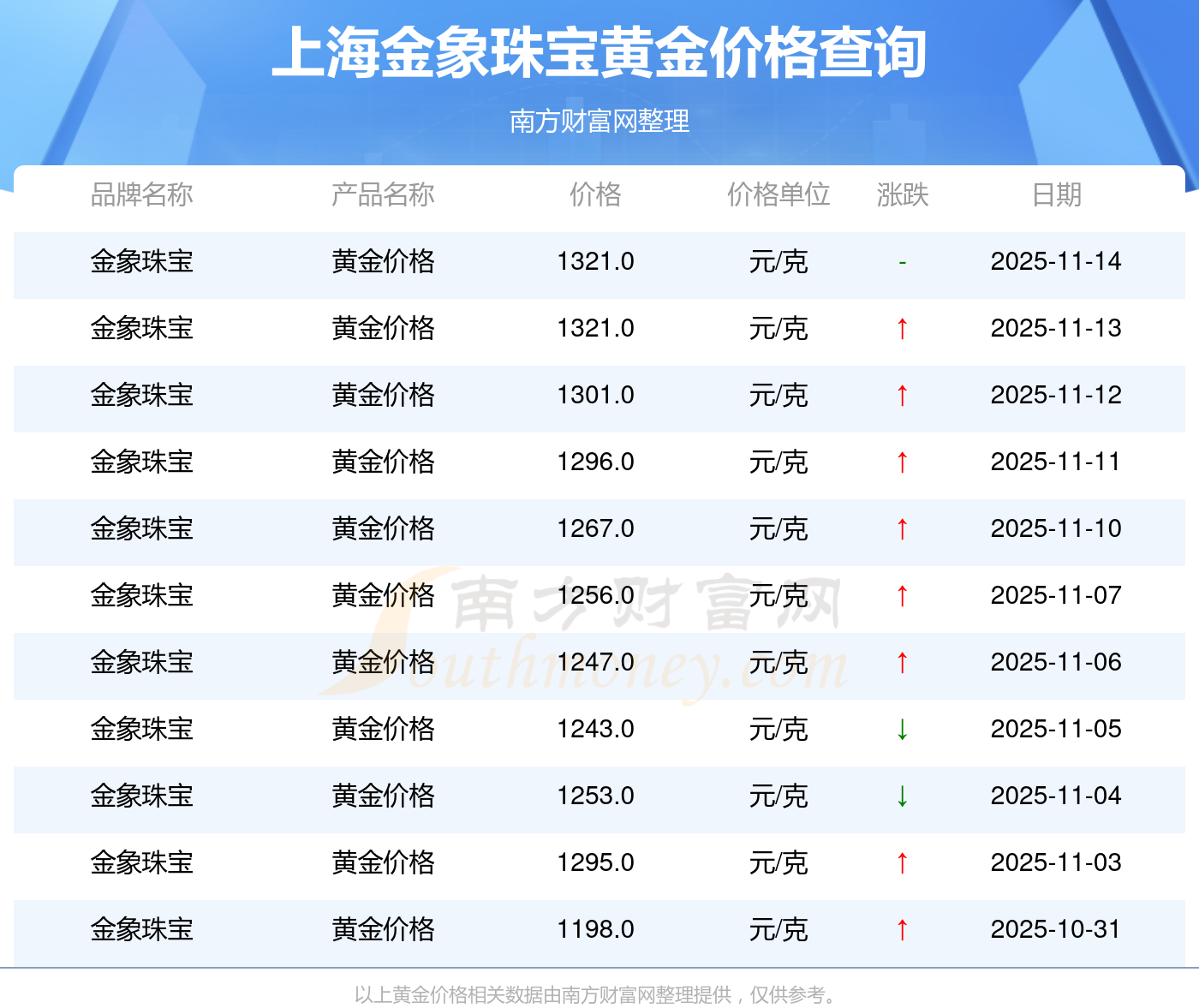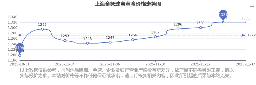 今日上海金象珠寶黃金價(jià)格的價(jià)格為1321.0元/克。