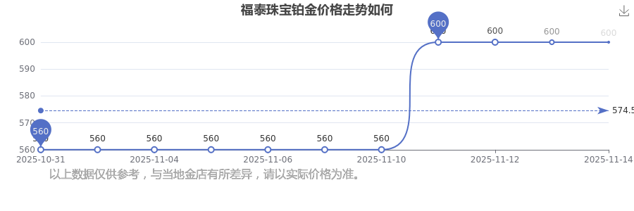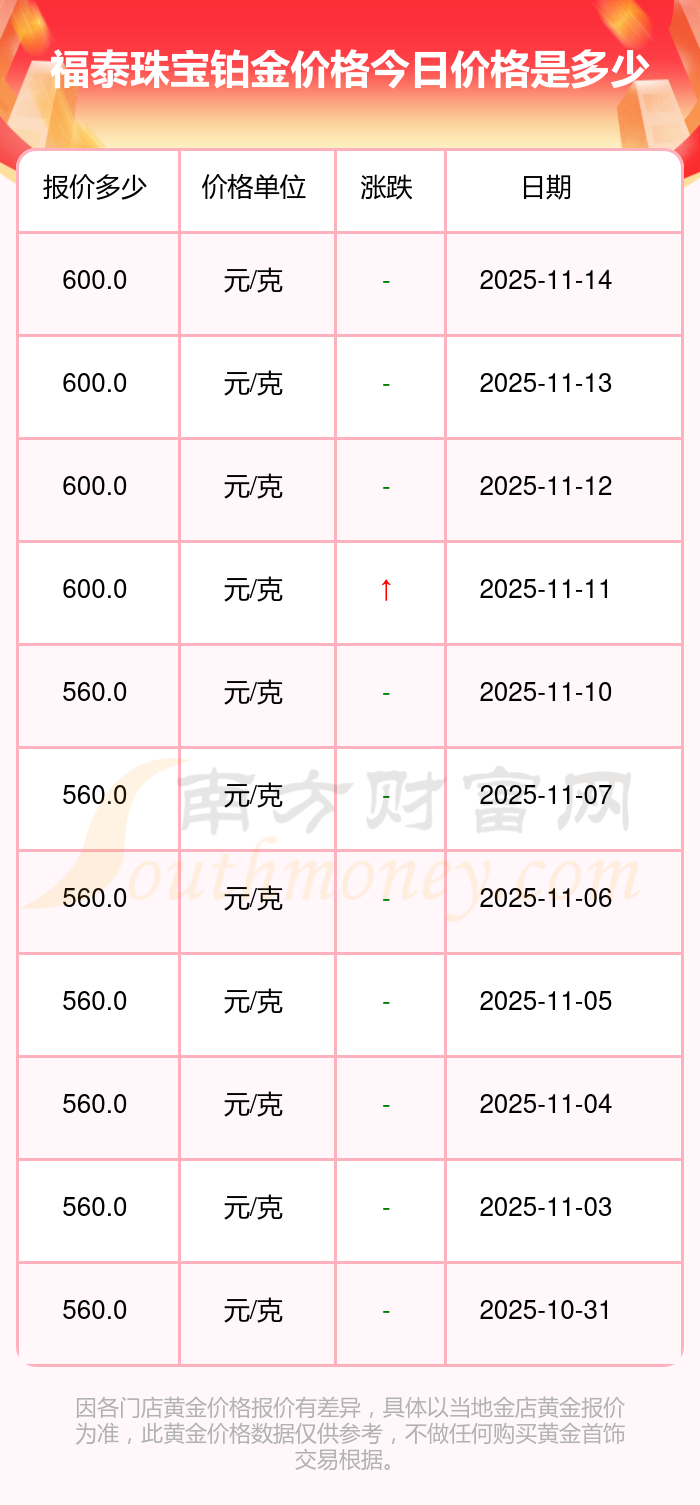 今日福泰珠寶鉑金價格最新價格為600.0元/克。