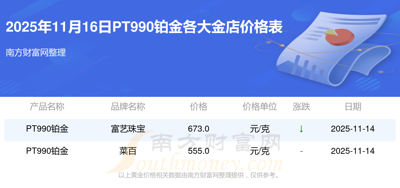2025年11月16日周大福、周大福、周大福、周大福、周大福、周大福、周大福、老鳳祥、老鳳祥、老鳳祥、周六福等各大金店品牌PT990鉑金最新價(jià)格如下:周大福黃金價(jià)格1333.0元/克,周大福鉑金價(jià)格646.0元/克,周大福飾品金價(jià)(內(nèi)地)1333.0元/克,周大福黃金飾品(香港)46320.0,周大福鉑金價(jià)格(香港)18410.0,周大福金條價(jià)格(香港)41780.0,周大福金條金價(jià)(內(nèi)地)1167.0元/克,老鳳祥黃金價(jià)格1322.0元/克,老鳳祥鉑金價(jià)格600.0元/克,老鳳祥足金價(jià)格1322.0元/克,周六福黃金價(jià)格1295.0元/克。
