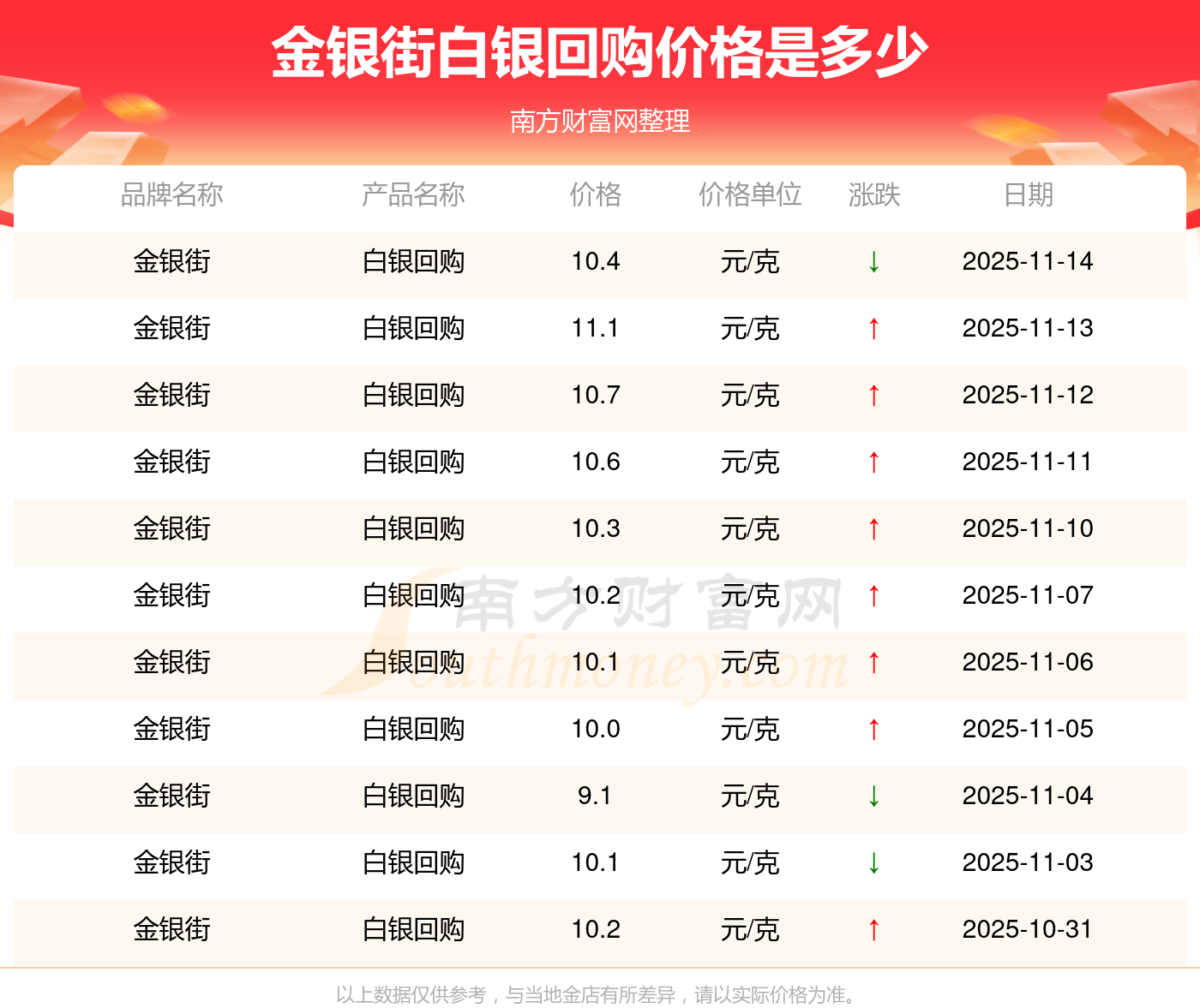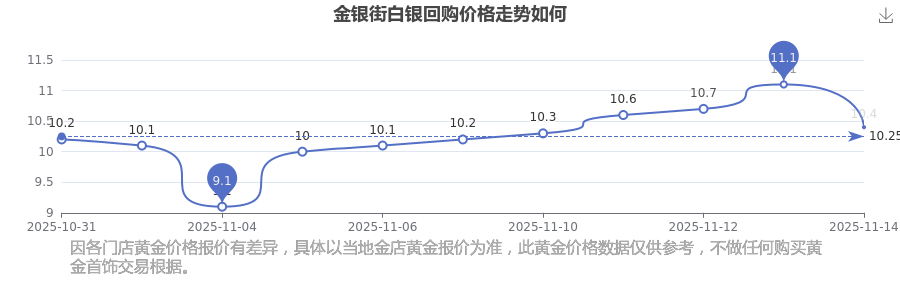 2025年11月16日金銀街白銀回購(gòu)價(jià)格:10.4元/克。