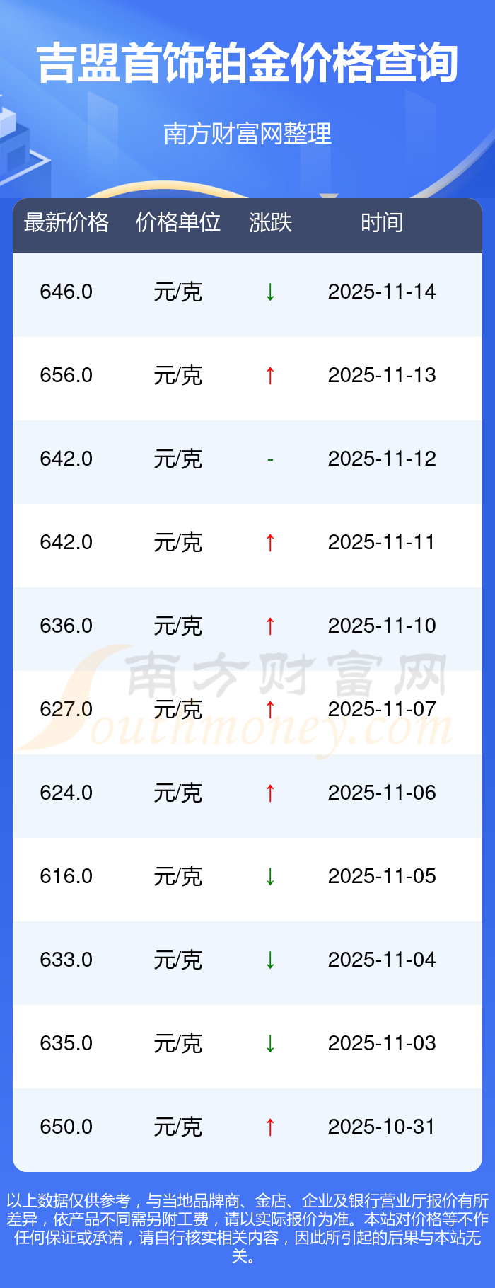 吉盟首飾今日鉑金價(jià)格的最新標(biāo)價(jià)為646.0元/克。