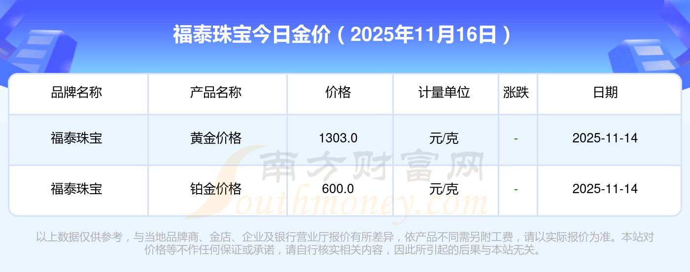 2025年11月16日福泰珠寶今日價(jià)格:黃金價(jià)格1333.0元/克,鉑金價(jià)格646.0元/克,飾品金價(jià)(內(nèi)地)1333.0元/克,黃金飾品(香港)46320.0,鉑金價(jià)格(香港)18410.0,金條價(jià)格(香港)41780.0,金條金價(jià)(內(nèi)地)1167.0元/克,黃金價(jià)格1322.0元/克,鉑金價(jià)格600.0元/克,足金價(jià)格1322.0元/克,黃金價(jià)格1295.0元/克。