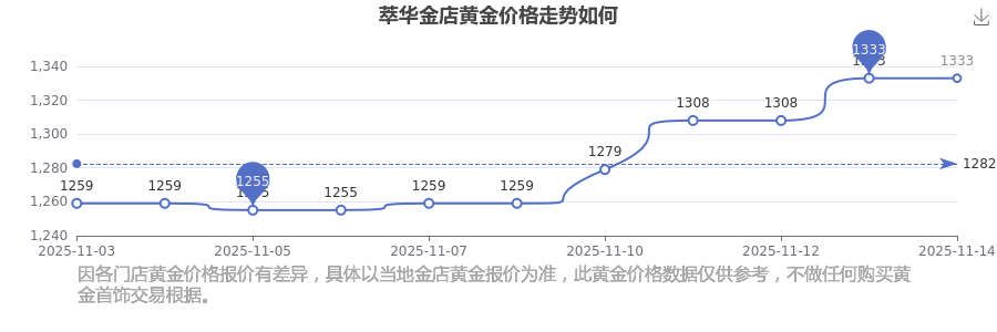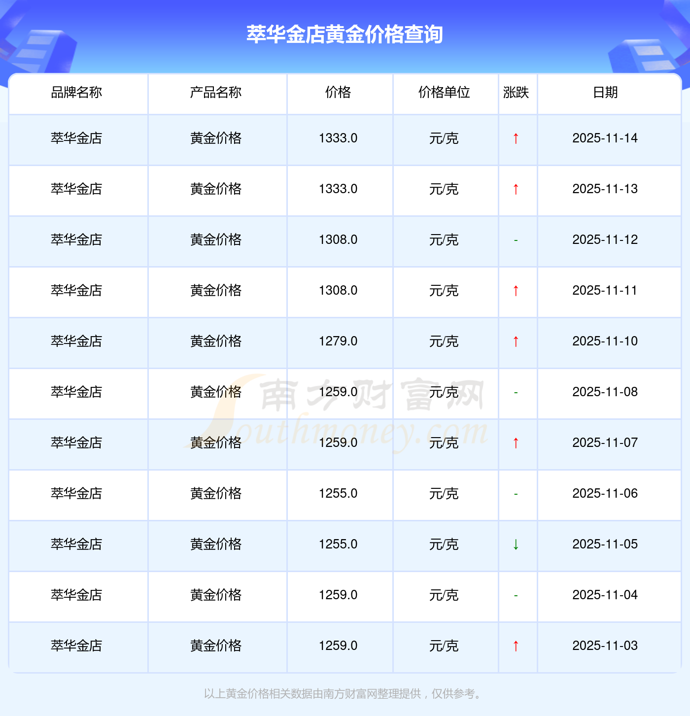 今日(2025年11月16日),萃華金店黃金價格:1333.0元/克。
