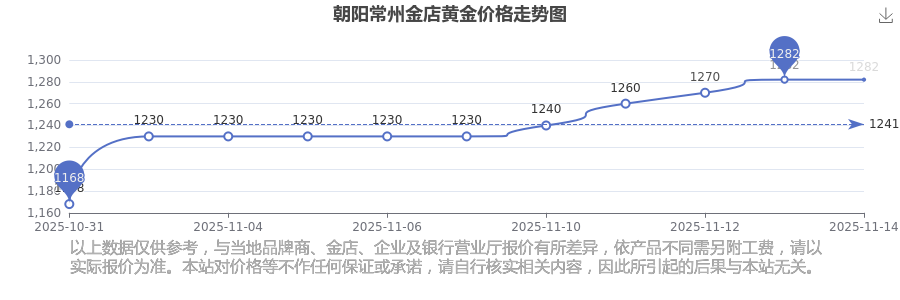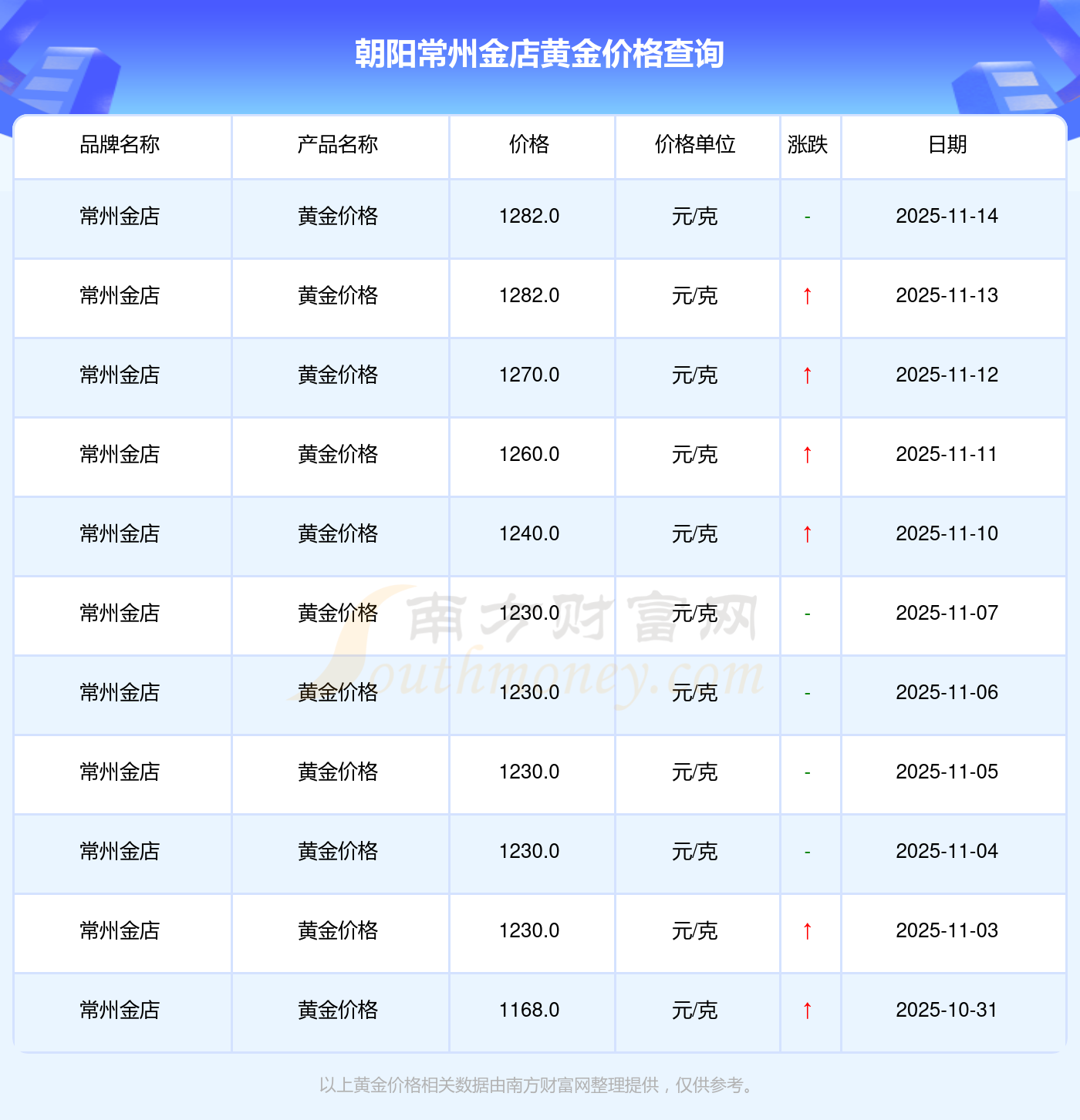 今日(2025年11月16日)朝陽常州金店黃金價格為1282.0元/克。