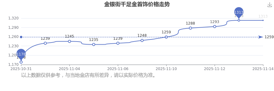 金銀街今日千足金首飾的最新市場行情價(jià)為1313.0元/克。