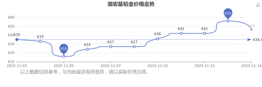 今日潮宏基 鉑金價(jià)格,最新確定為646.0元/克。