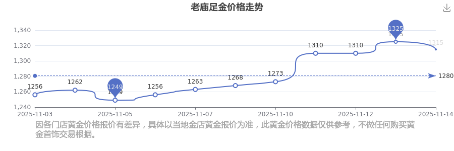 老廟 足金價格于今日的最新掛牌價為1315.0元/克。