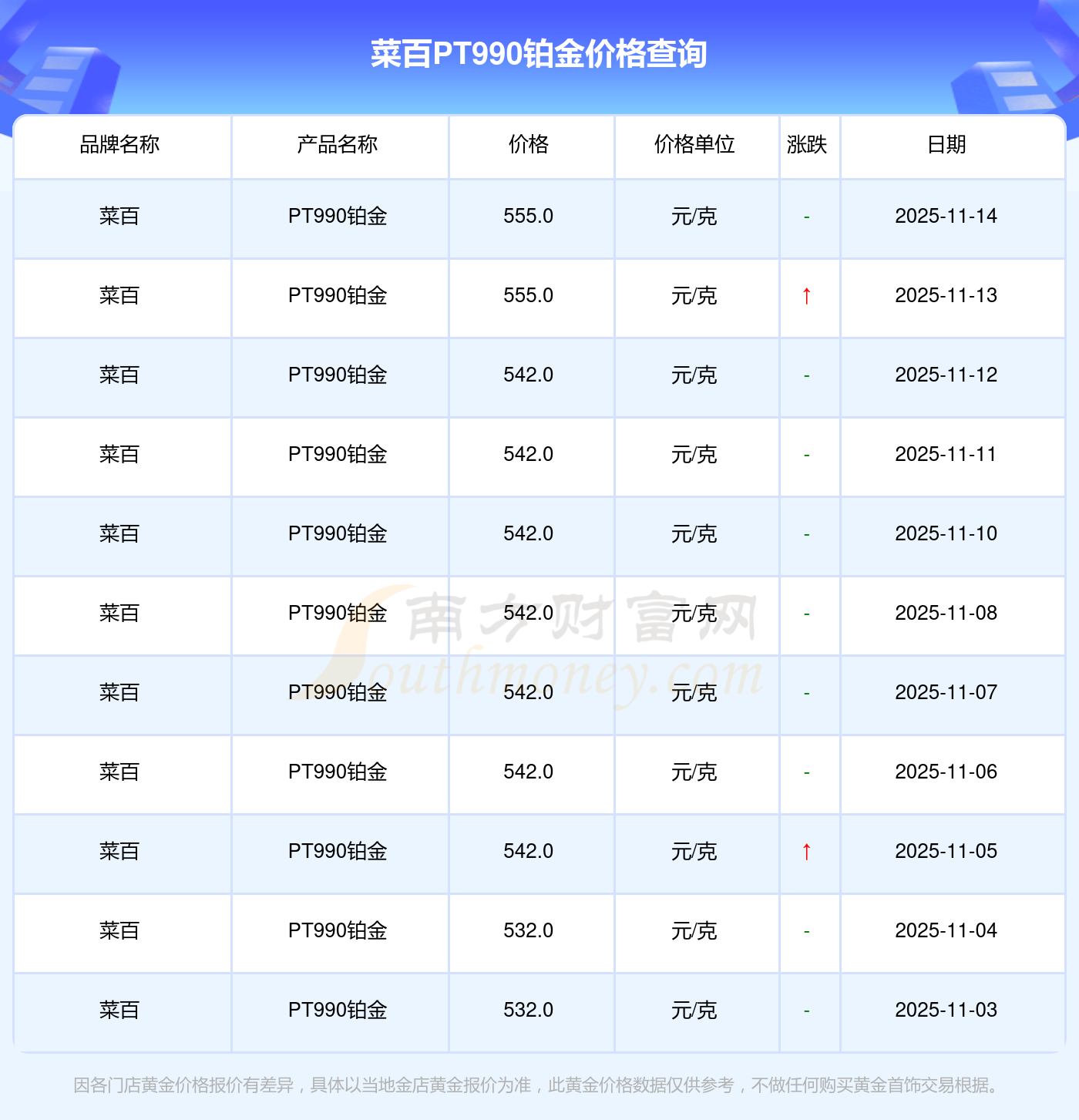 以上數(shù)據(jù)僅供參考,與當(dāng)?shù)仄放粕、金店、企業(yè)及銀行營業(yè)廳報(bào)價(jià)有所差異,依產(chǎn)品不同需另附工費(fèi),請(qǐng)以實(shí)際報(bào)價(jià)為準(zhǔn)。本站對(duì)價(jià)格等不作任何保證或承諾,請(qǐng)自行核實(shí)相關(guān)內(nèi)容,因此所引起的后果與本站無關(guān)。