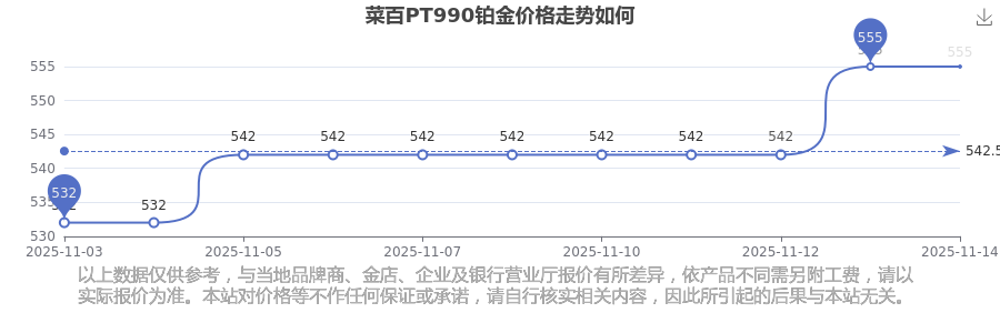 菜百 PT990鉑金今日最新的價(jià)位是555.0元/克。