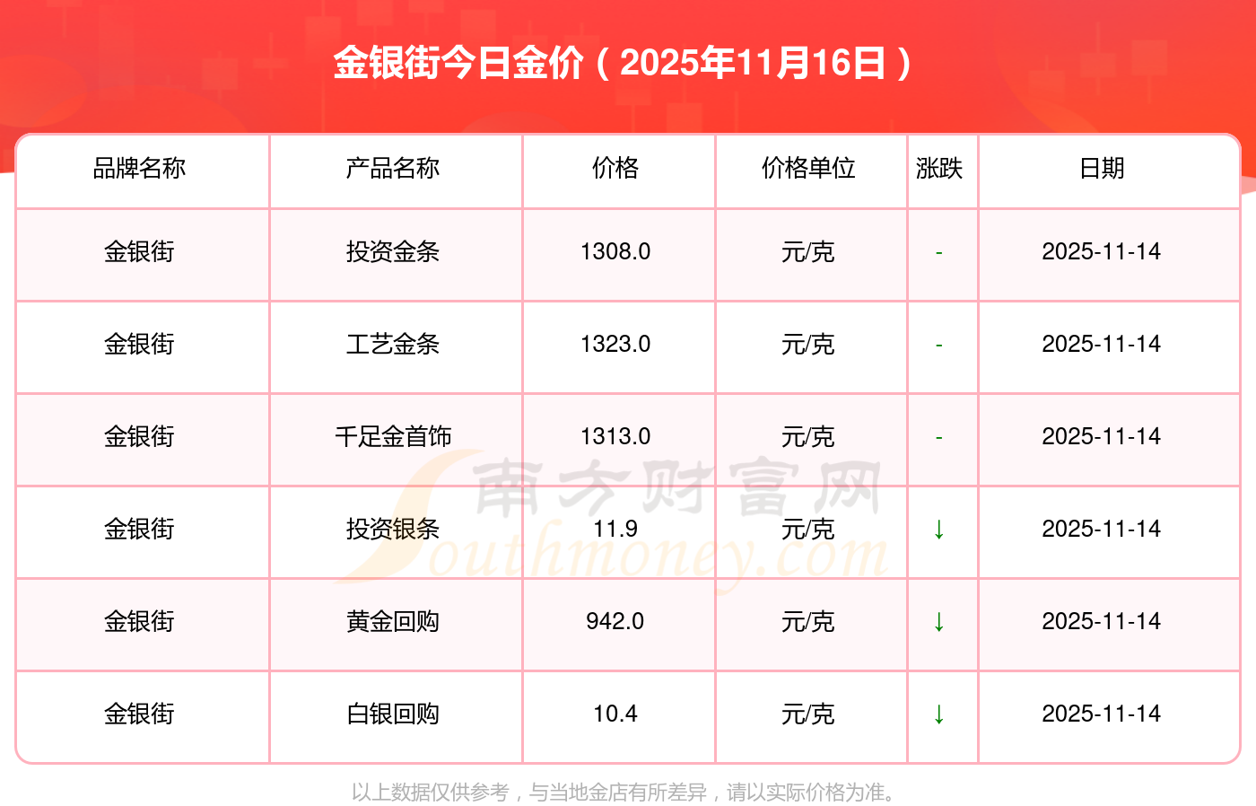 因各門(mén)店黃金價(jià)格報(bào)價(jià)有差異,具體以當(dāng)?shù)亟鸬挈S金報(bào)價(jià)為準(zhǔn),此黃金價(jià)格數(shù)據(jù)僅供參考,不做任何購(gòu)買(mǎi)黃金首飾交易根據(jù)。