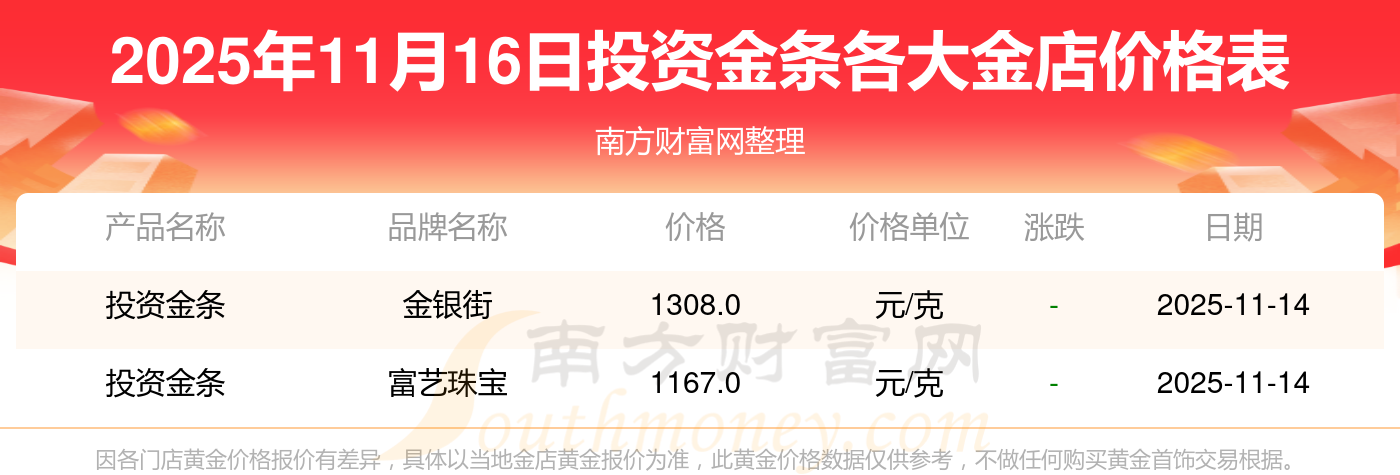 2025年11月16日,周大福、周大福、周大福、周大福、周大福、周大福、周大福、老鳳祥、老鳳祥、老鳳祥、周六福等各大金店品牌投資金條今日價(jià)格如下:周大福1333.0元/克、周大福646.0元/克、周大福1333.0元/克、周大福46320.0、周大福18410.0、周大福41780.0、周大福1167.0元/克、老鳳祥1322.0元/克、老鳳祥600.0元/克、老鳳祥1322.0元/克、周六福1295.0元/克。