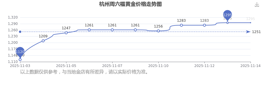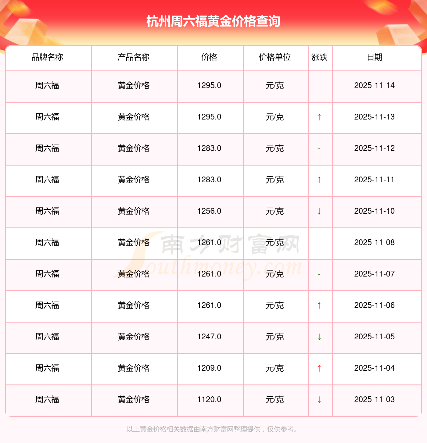 今日(2025年11月16日),杭州周六福黃金價格每克的價值為1295.0元/克。