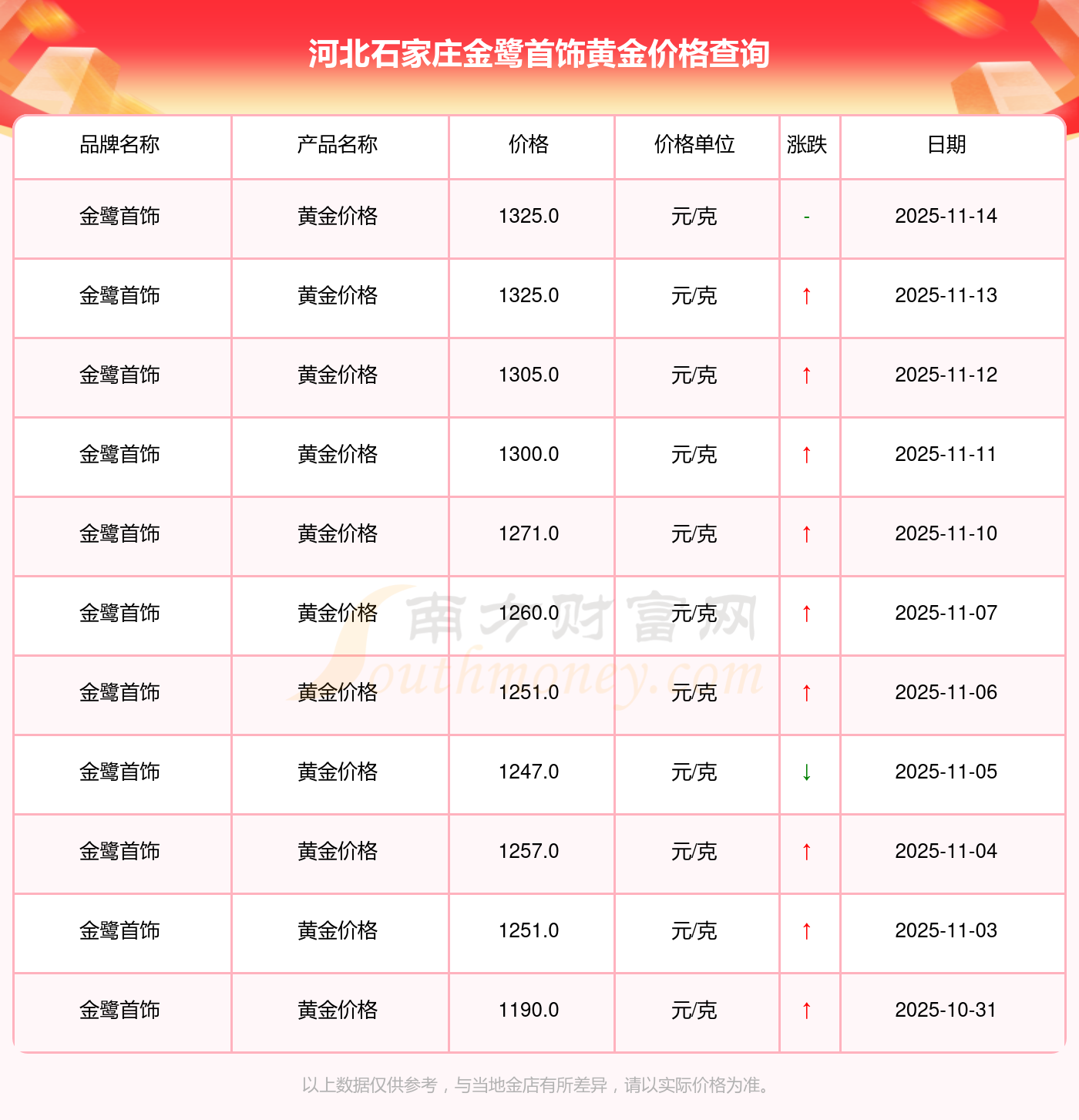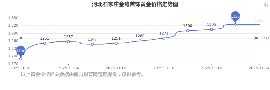 2025年11月16日,河北石家莊金鷺首飾黃金價(jià)格每克的售賣(mài)價(jià)位為1325.0元/克。