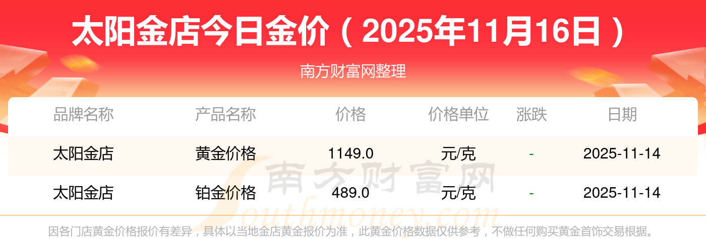 2025年11月16日太陽(yáng)金店今日價(jià)格:黃金價(jià)格1333.0元/克,鉑金價(jià)格646.0元/克,飾品金價(jià)(內(nèi)地)1333.0元/克,黃金飾品(香港)46320.0,鉑金價(jià)格(香港)18410.0,金條價(jià)格(香港)41780.0,金條金價(jià)(內(nèi)地)1167.0元/克,黃金價(jià)格1322.0元/克,鉑金價(jià)格600.0元/克,足金價(jià)格1322.0元/克,黃金價(jià)格1295.0元/克。