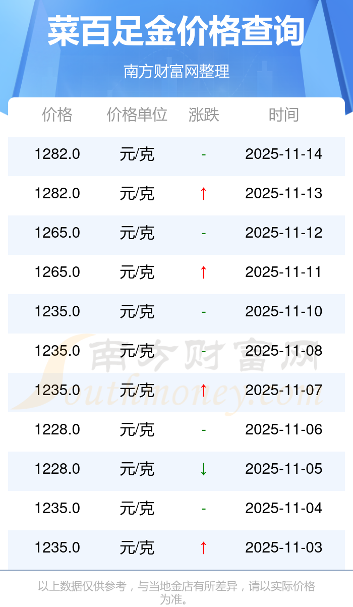 今日菜百 足金價格最新的克重售價為1282.0元/克。