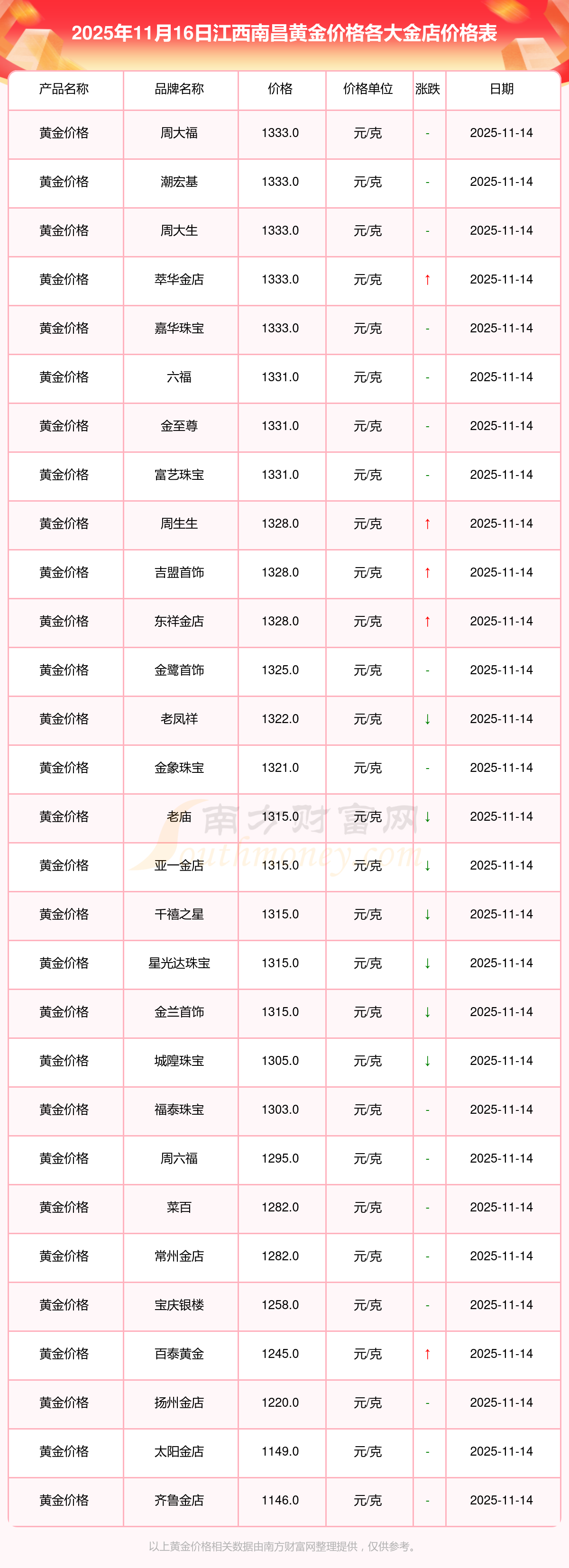 2025年11月16日江西南昌周大福、周大福、周大福、周大福、周大福、周大福、周大福、老鳳祥、老鳳祥、老鳳祥、周六福等各大金店品牌黃金價格最新價格行情來了,如下:周大福黃金價格1333.0元/克,周大福鉑金價格646.0元/克,周大福飾品金價(內(nèi)地)1333.0元/克,周大福黃金飾品(香港)46320.0,周大福鉑金價格(香港)18410.0,周大福金條價格(香港)41780.0,周大福金條金價(內(nèi)地)1167.0元/克,老鳳祥黃金價格1322.0元/克,老鳳祥鉑金價格600.0元/克,老鳳祥足金價格1322.0元/克,周六福黃金價格1295.0元/克。