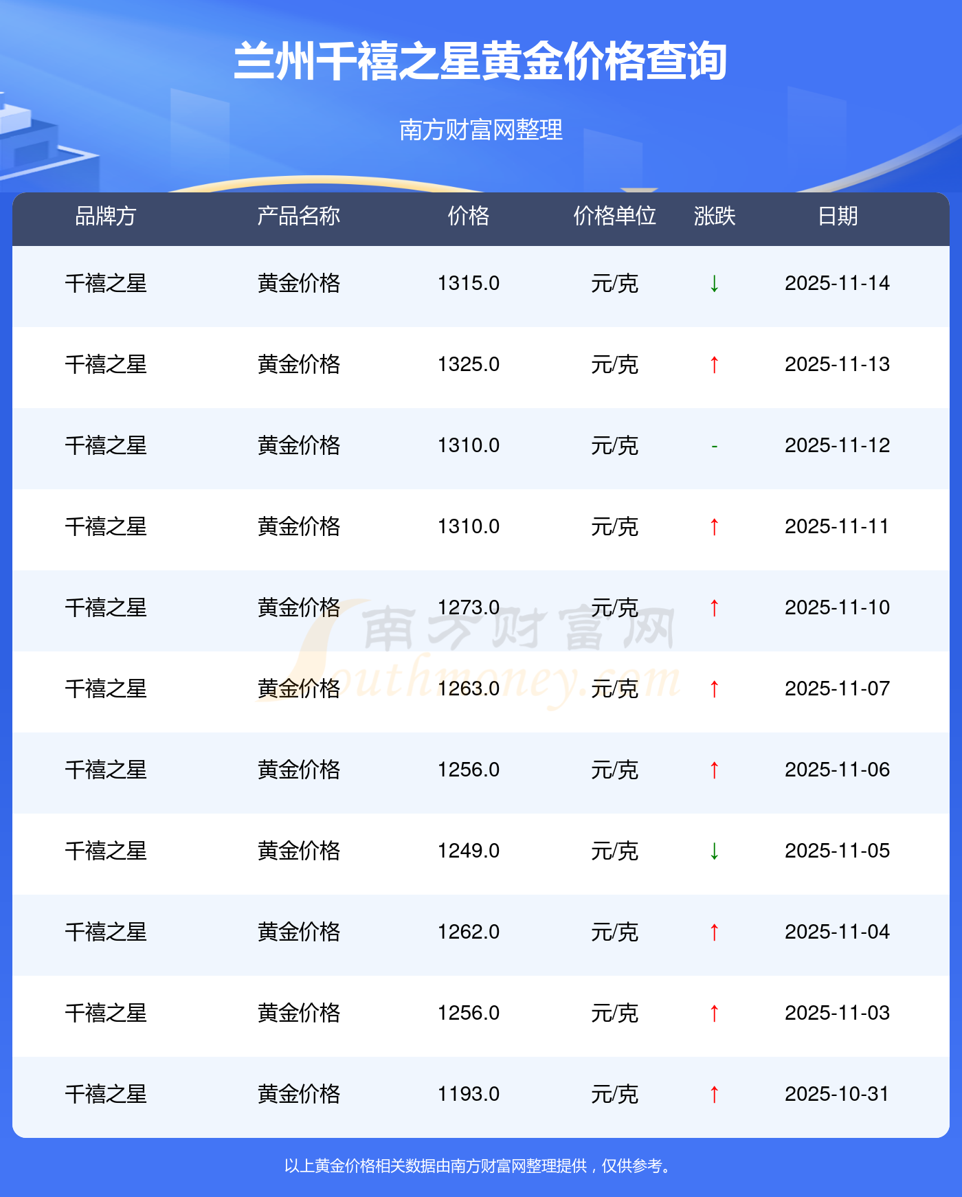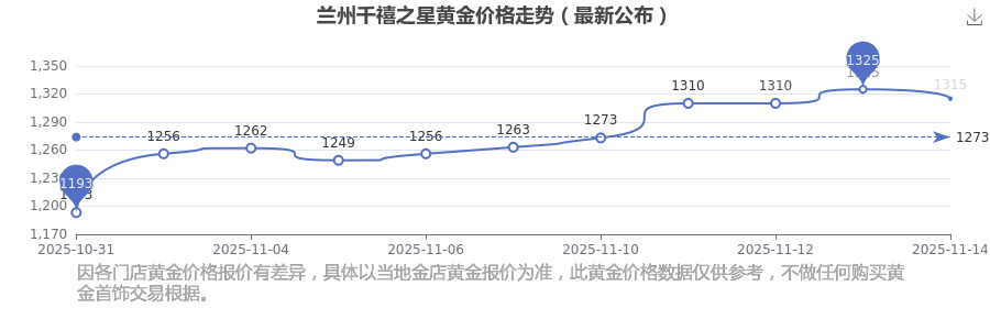 2025年11月16日,蘭州千禧之星黃金價(jià)格每克的價(jià)值量定格在1315.0元/克。