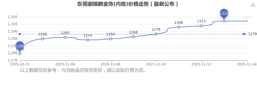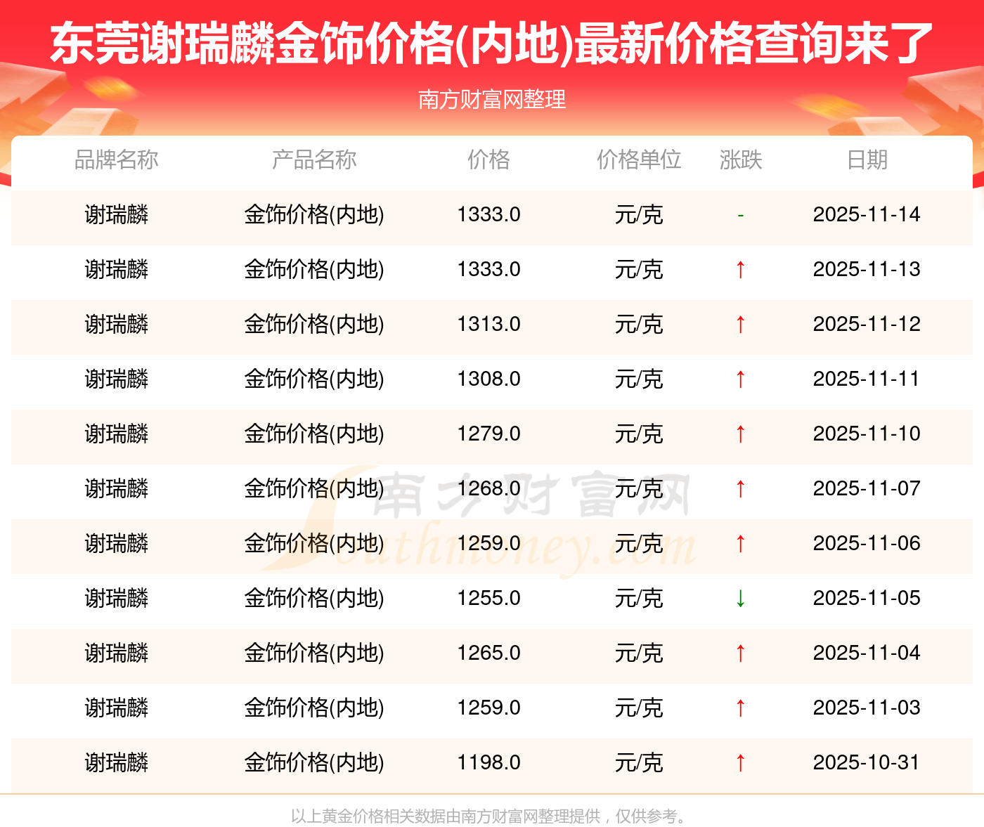 2025年11月16日,東莞謝瑞麟金飾價格(內(nèi)地)每克的價值量定格在1333.0元/克。