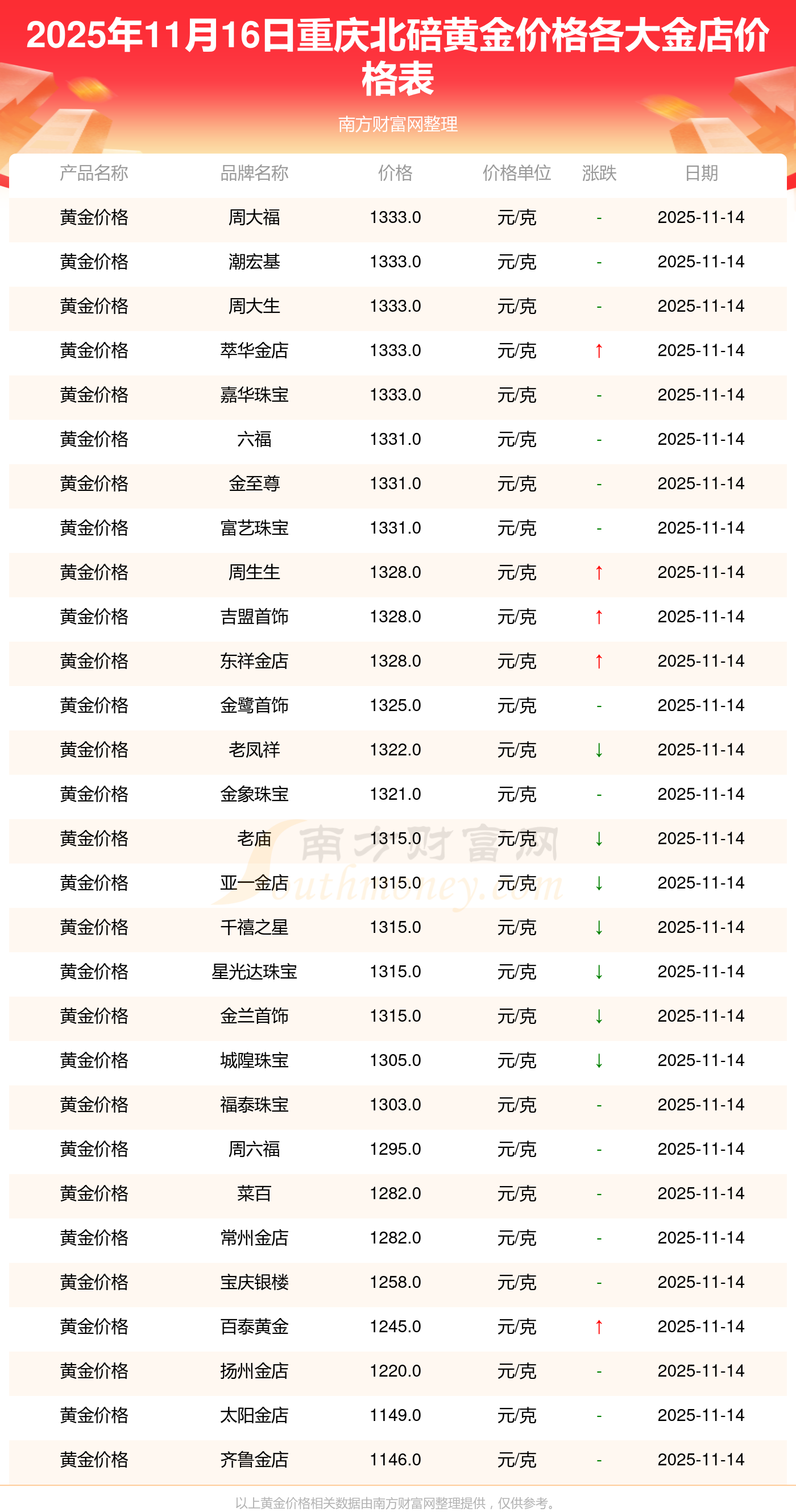 今天是2025年11月16日,重慶北碚周大福、周大福、周大福、周大福、周大福、周大福、周大福、老鳳祥、老鳳祥、老鳳祥、周六福等各大金店品牌黃金價(jià)格最新價(jià)格如下:周大福1333.0元/克、周大福646.0元/克、周大福1333.0元/克、周大福46320.0、周大福18410.0、周大福41780.0、周大福1167.0元/克、老鳳祥1322.0元/克、老鳳祥600.0元/克、老鳳祥1322.0元/克、周六福1295.0元/克。