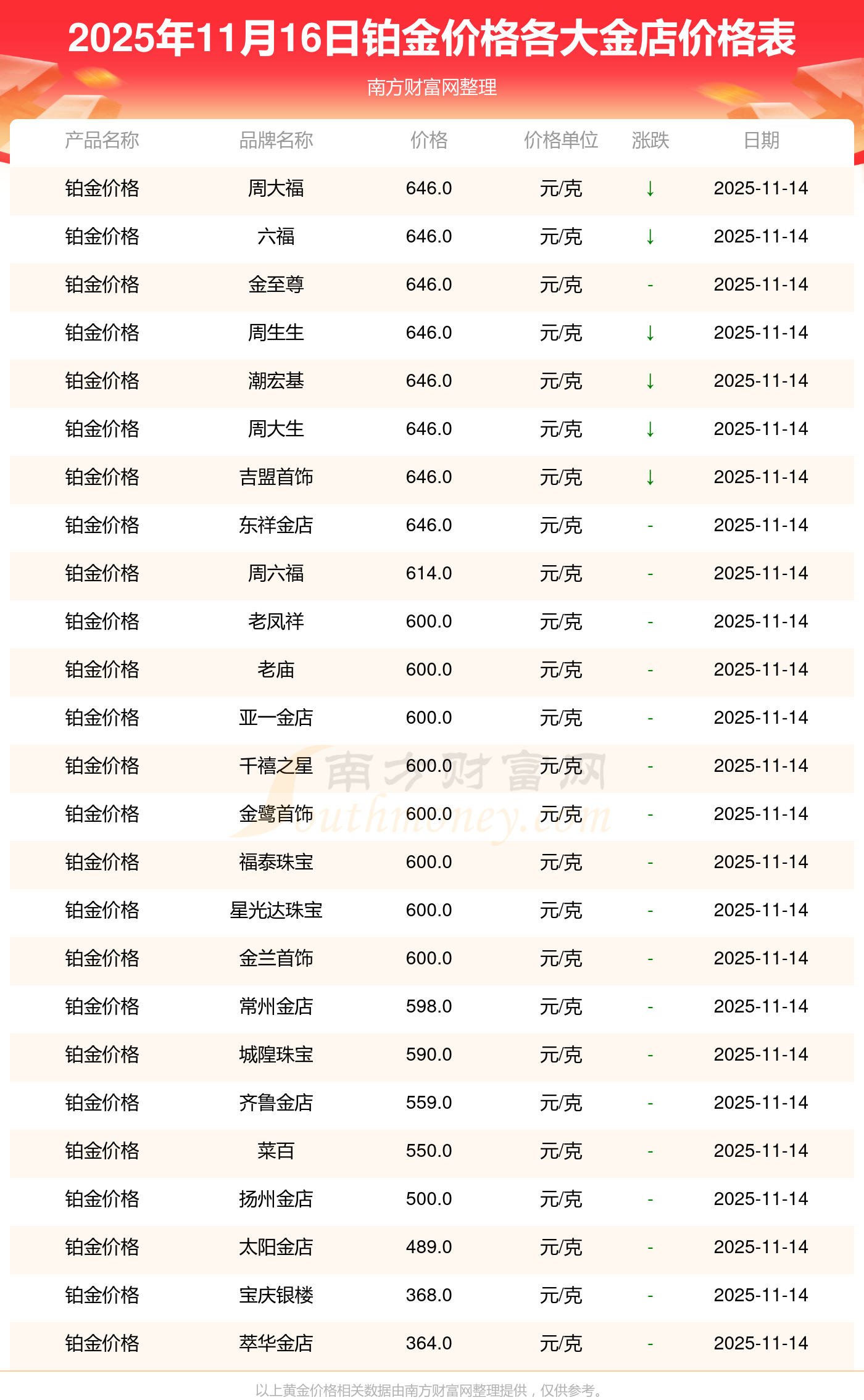 今天是2025年11月16日,周大福、周大福、周大福、周大福、周大福、周大福、周大福、老鳳祥、老鳳祥、老鳳祥、周六福等各大金店品牌鉑金價(jià)格最新價(jià)格如下:周大福1333.0元/克、周大福646.0元/克、周大福1333.0元/克、周大福46320.0、周大福18410.0、周大福41780.0、周大福1167.0元/克、老鳳祥1322.0元/克、老鳳祥600.0元/克、老鳳祥1322.0元/克、周六福1295.0元/克。