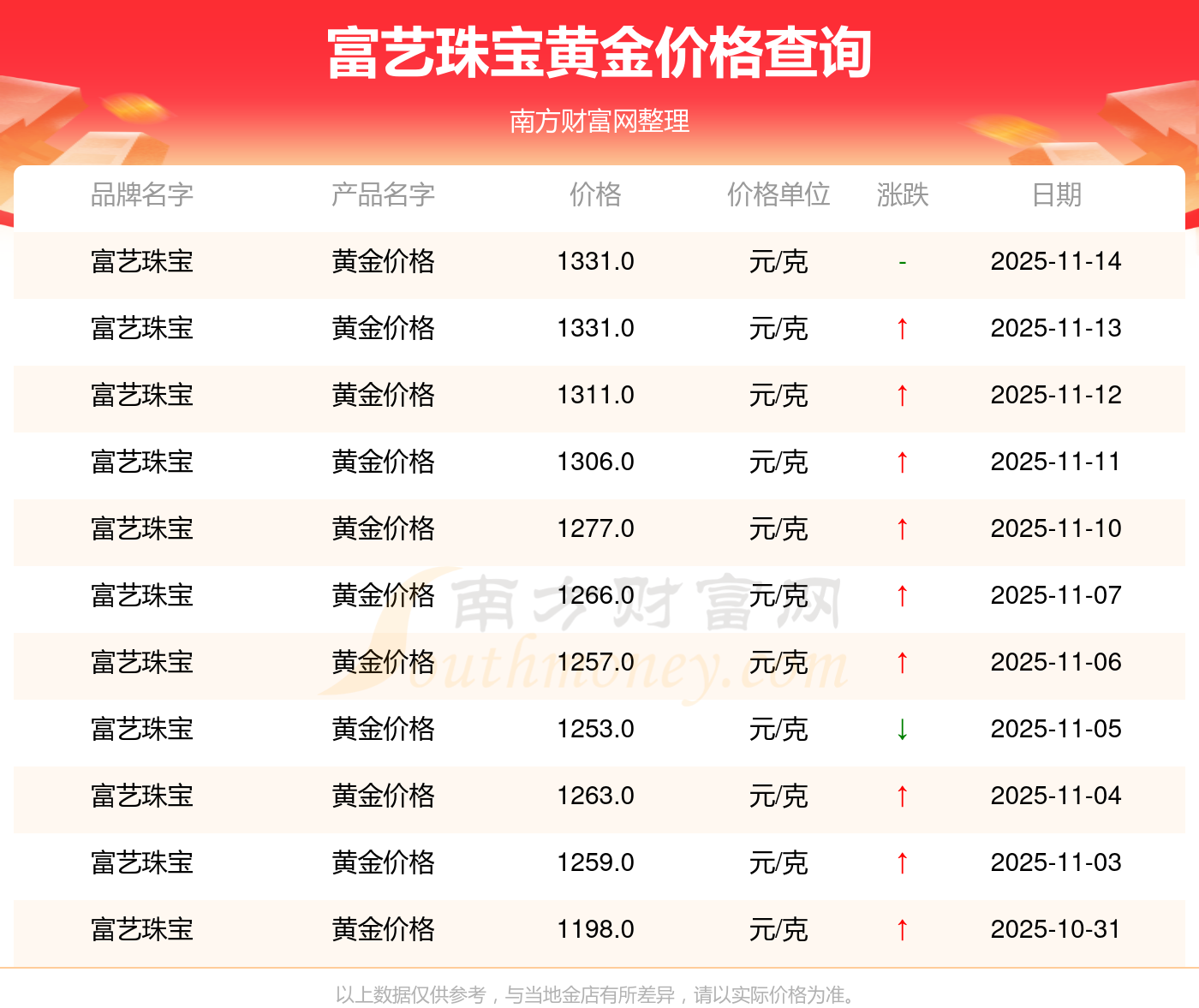 今日富藝珠寶黃金價(jià)格是1331.0元/克。