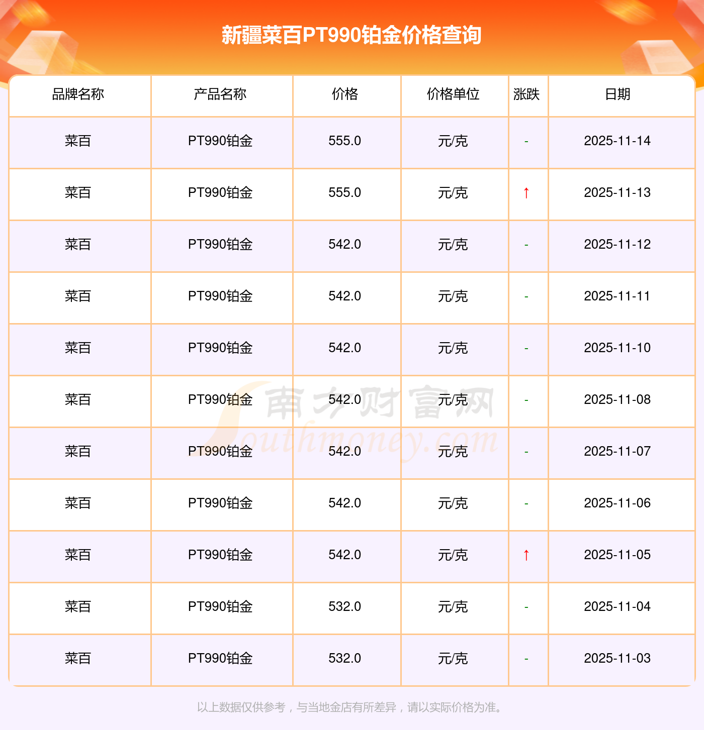 今日(2025年11月16日),新疆菜百PT990鉑金的定價(jià)為 555.0元/克。