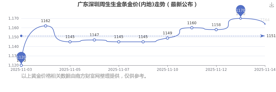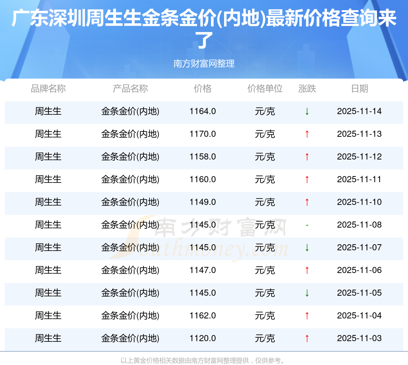 今日(2025年11月16日),廣東深圳周生生金條金價(內(nèi)地)每克的價值為1164.0元/克。