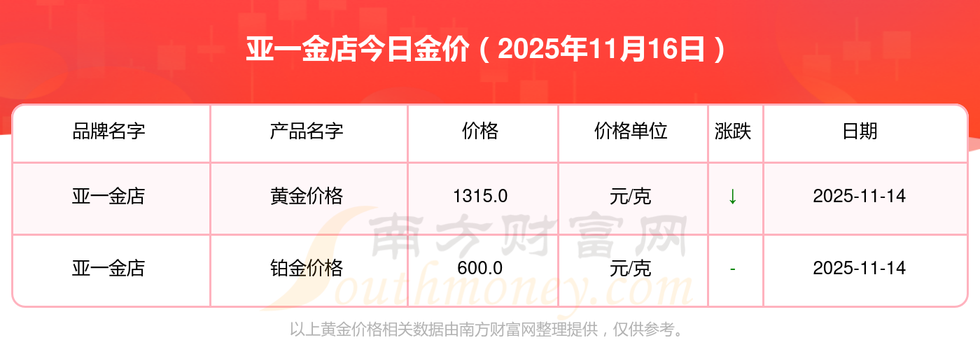 2025年11月16日周大福、周大福、周大福、周大福、周大福、周大福、周大福、老鳳祥、老鳳祥、老鳳祥、周六福等各大金店品牌黃金價格最新價格如下:周大福黃金價格1333.0元/克,周大福鉑金價格646.0元/克,周大福飾品金價(內(nèi)地)1333.0元/克,周大福黃金飾品(香港)46320.0,周大福鉑金價格(香港)18410.0,周大福金條價格(香港)41780.0,周大福金條金價(內(nèi)地)1167.0元/克,老鳳祥黃金價格1322.0元/克,老鳳祥鉑金價格600.0元/克,老鳳祥足金價格1322.0元/克,周六福黃金價格1295.0元/克。