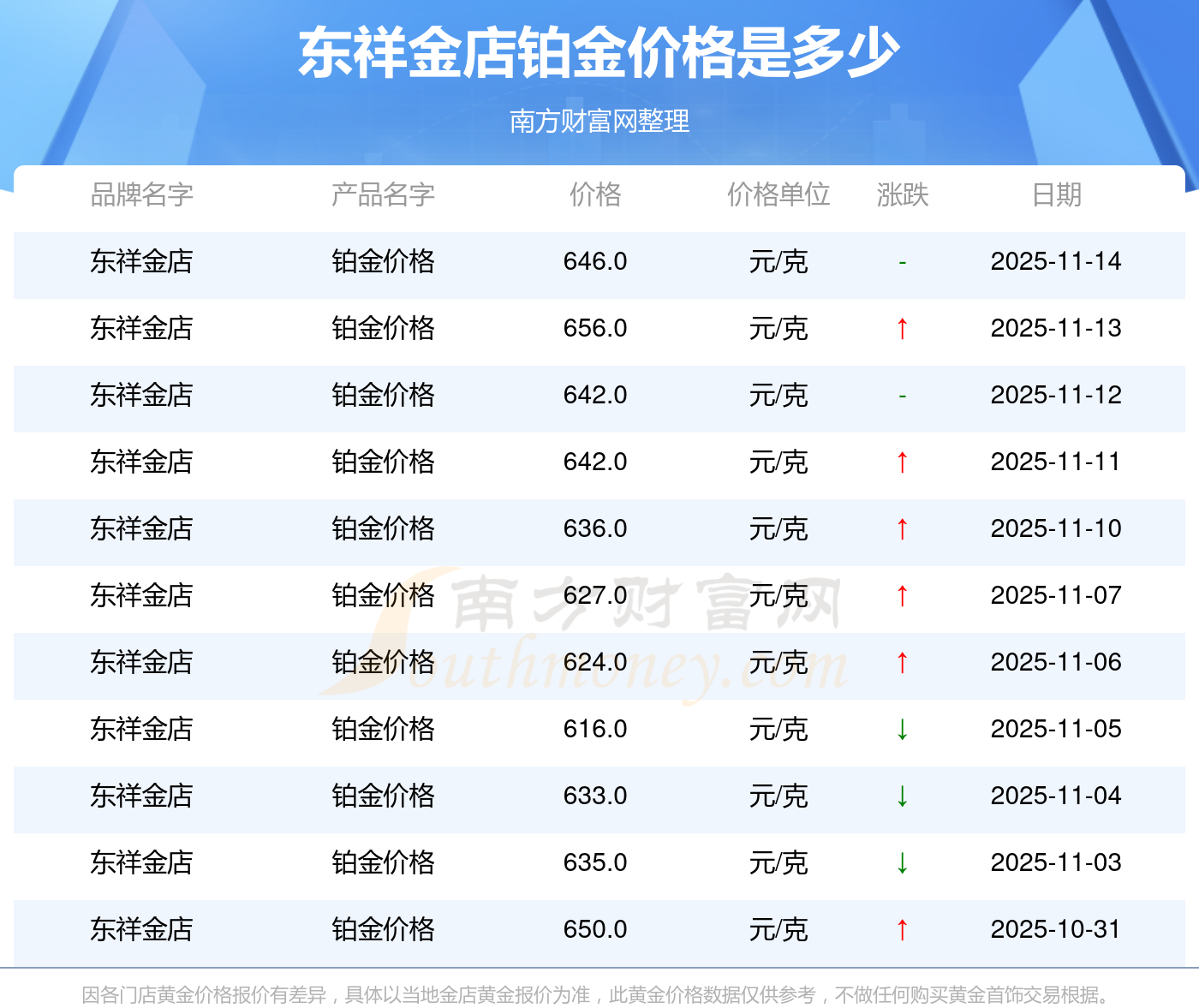 東祥金店今日鉑金價格的最新市場行情價為646.0元/克。