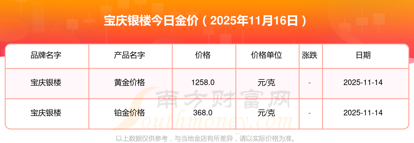 現(xiàn)在寶慶銀樓黃金價格是多少錢1克_2025年寶慶銀樓今日金價是多少錢一克,最新寶慶銀樓查詢,2025年11月16日寶慶銀樓鉑金價格現(xiàn)在每克多少錢?最新寶慶銀樓鉑金價格報價公布,一起來看看吧!