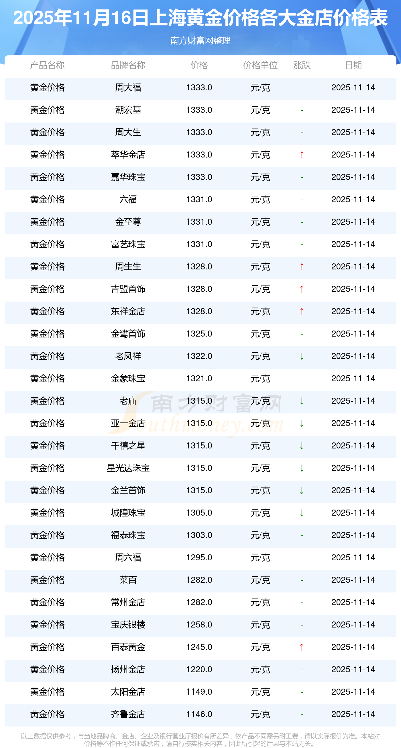 2025年11月16日上海各大金店黃金價(jià)格最新價(jià)格查詢來了:周大福1333.0元/克,周大福646.0元/克,周大福1333.0元/克,周大福46320.0,周大福18410.0,周大福41780.0,周大福1167.0元/克,老鳳祥1322.0元/克,老鳳祥600.0元/克,老鳳祥1322.0元/克,周六福1295.0元/克。